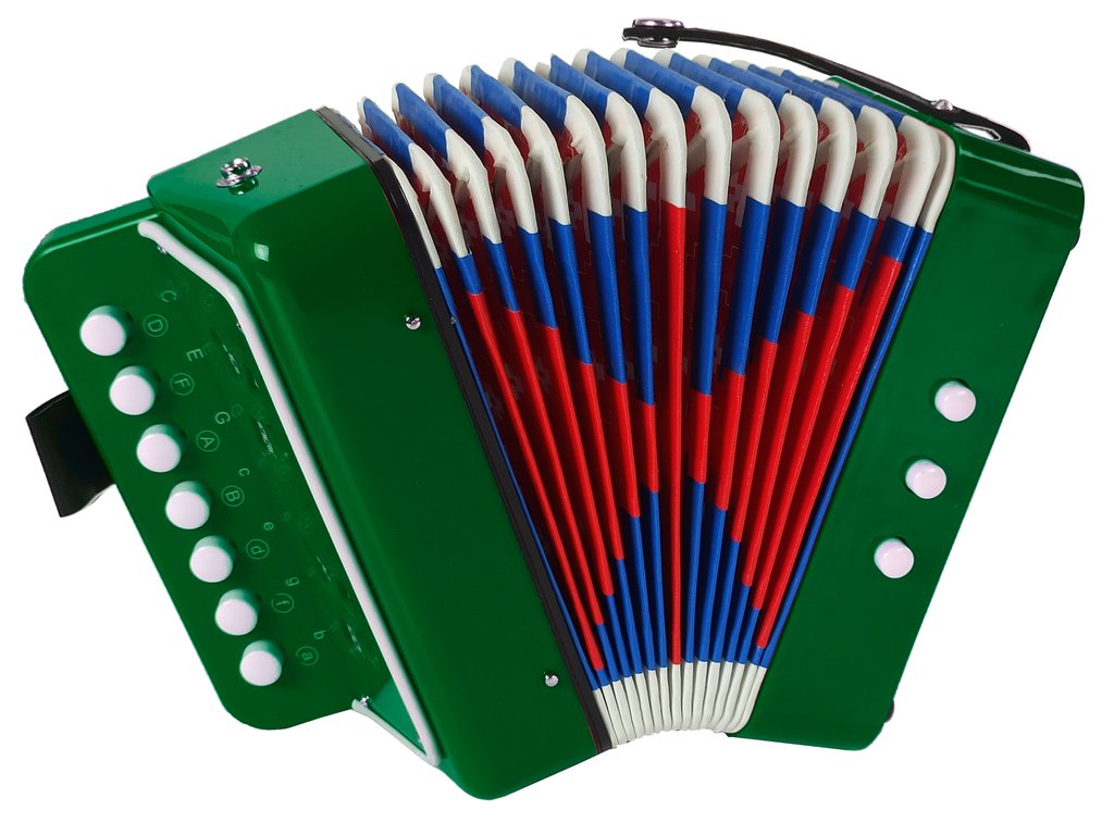 Akordeón je fantastická hračka pre deti, ktoré majú rady hudbu a zábavu. Nástroj vyzerá ako skutočný. Dokonale rozvíja detskú motoriku a sluch a zároveň dieťa pripraví na hru na skutočný nástroj. Princíp harmoniky je rovnaký ako pri skutočnom nástroji, na vydanie zvuku treba harmoniku rozbaliť a zložiť, má basové a zvukové tlačidlo a rukoväť.
