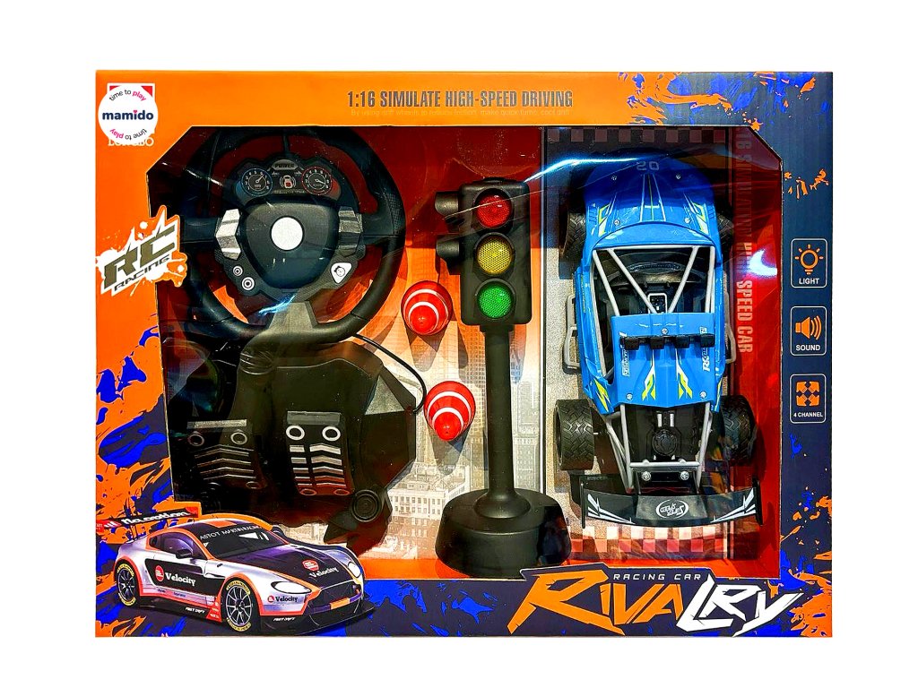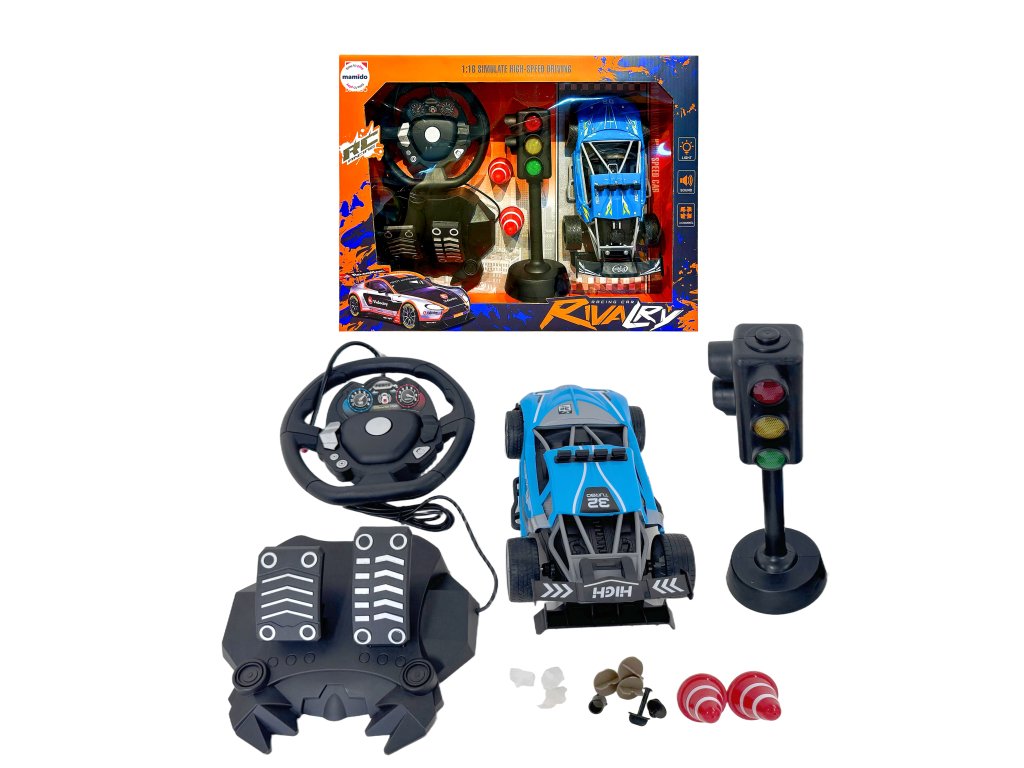 Auto na diaľkové ovládanie 1:16 pretekársky model s volantom, pedálmi a semaformi modré MT1345