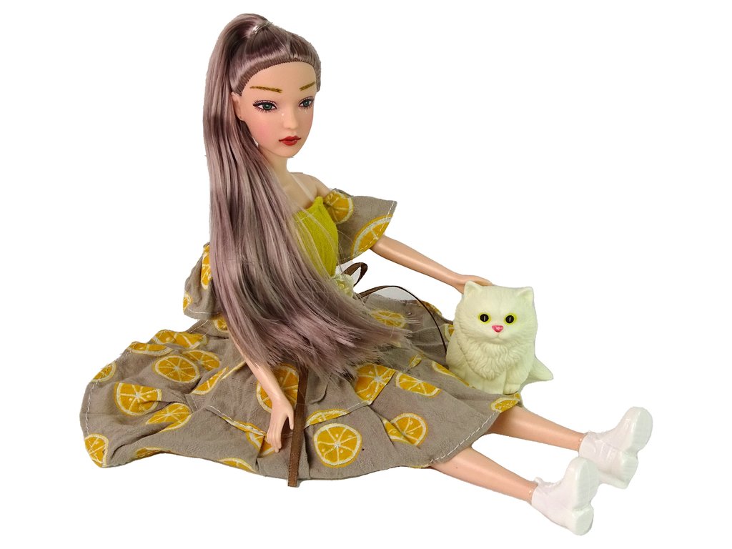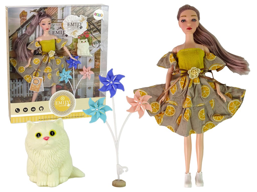Predstavujeme bábiku Emily s vetráčikmi a roztomilým mačiatkom, ktoré umožnia vášmu dieťaťu rozvíjať svoju predstavivosť cez hranie s priloženými výrobkami. Postavička Emily má vzdušné krásne šaty s oranžovým vzorom, opasok s kvetinou a biele topánočky, ktoré jej dodávajú športový štýl a môže hýbať rukami, nohami aj hlavou. Bábika má krásne modré oči a dlhé vlasy. Mačiatko po stlačení vydáva zvukové efekty mňaukania.