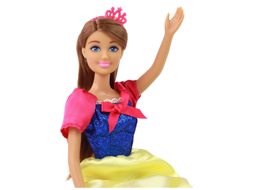 Bábika má na hlave ružovú korunku a jej oblečenie je skutočným módnym klenotom. Horná časť šiat je modrá s ružovými rukávmi a mašľou, spodná časť je elegantne hladká a žltá. Ružové podpätky dodávajú celému outfitu eleganciu.