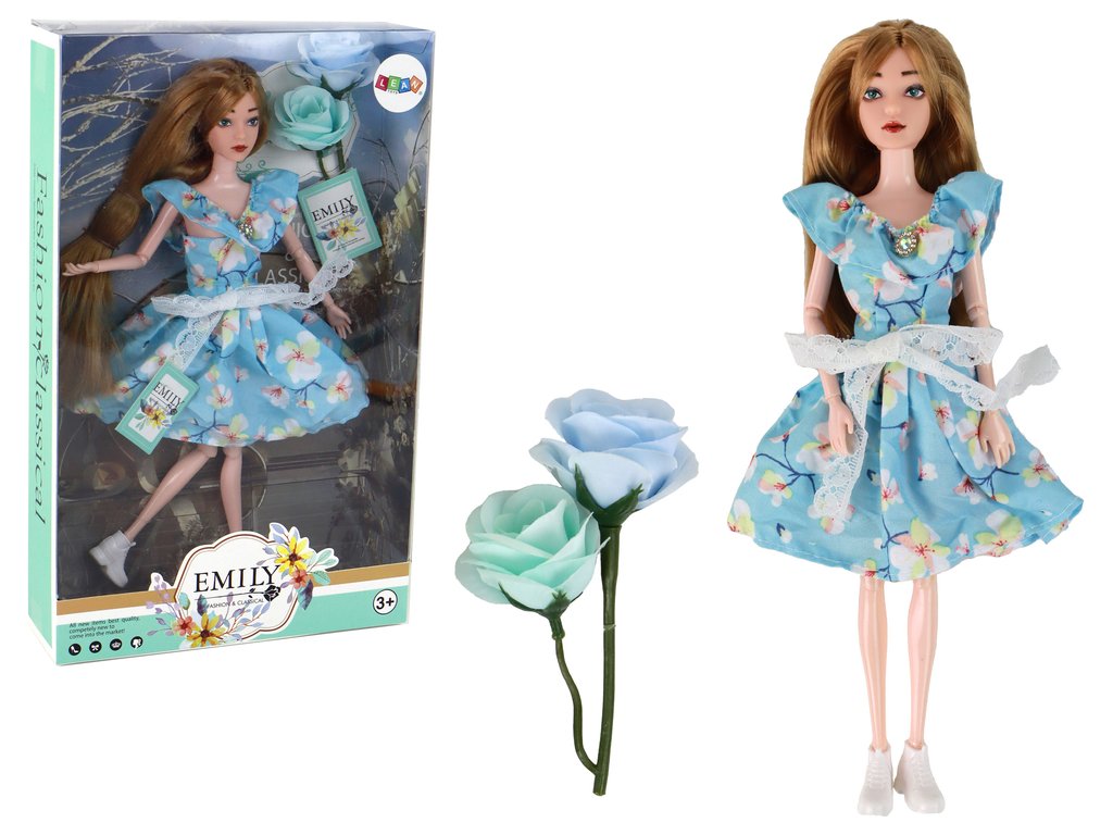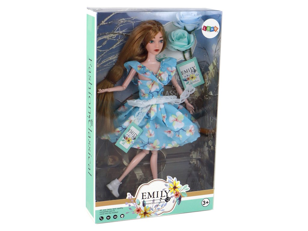 Bábika pre deti Emily Jarné dlhé vlasy modré kvetinové šaty