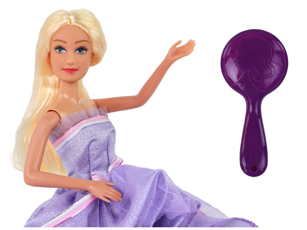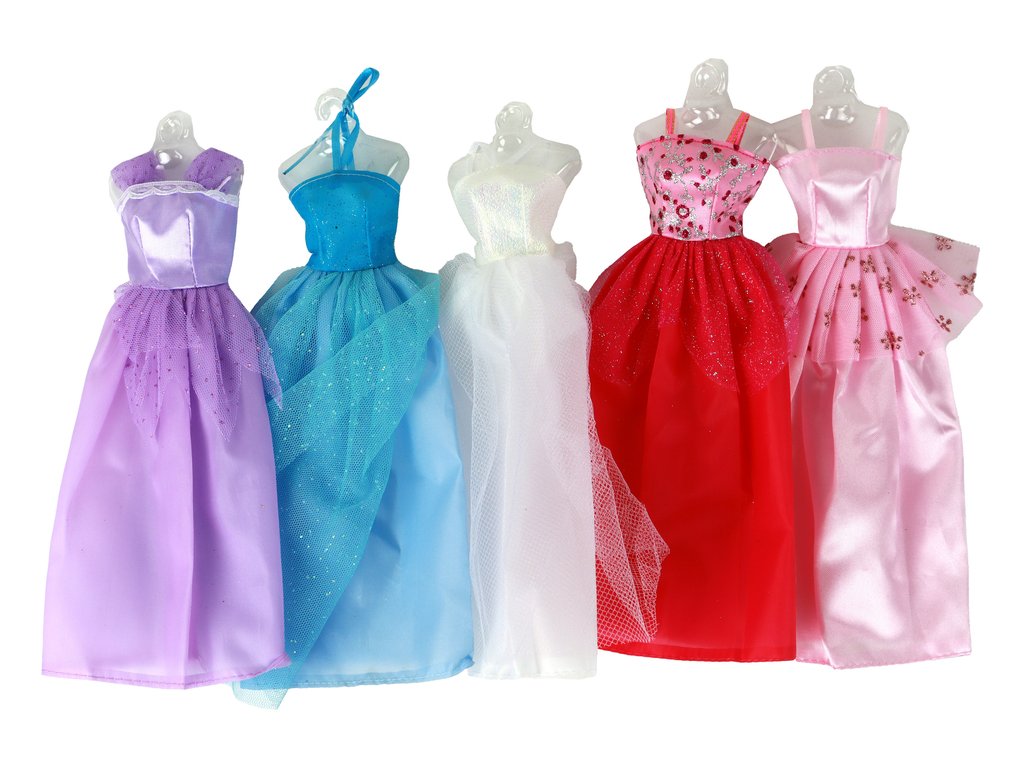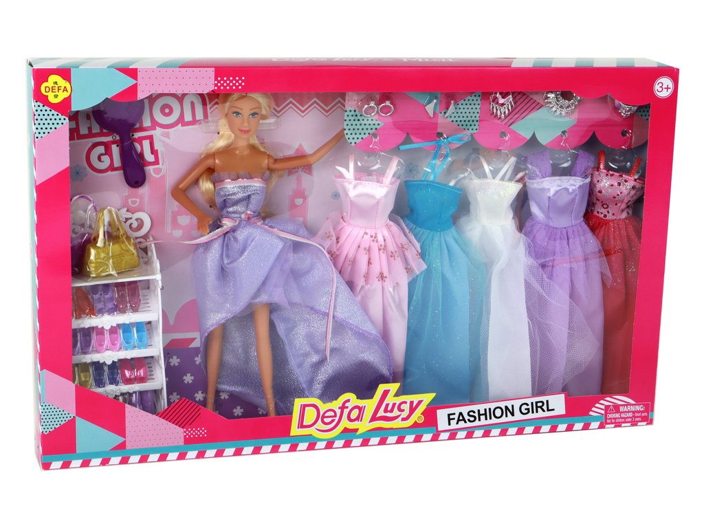 A to nie je všetko! Súprava obsahuje aj elegantnú bielu skriňu s 12 pármi výmenných topánok na podpätku. Bábika má k dispozícii až 5 rôznych večerných šiat, vrátane bielych, fialových, tmavo ružových, modrých a svetlo ružových, s tylovými doplnkami a trblietavými ozdobami. Navyše je sada bohatá na doplnky, ako sú 2 páry strieborných náušníc, 2 kabelky (fialová a zlatá), 3 náhrdelníky, vlásenka a kefa na vlasy.