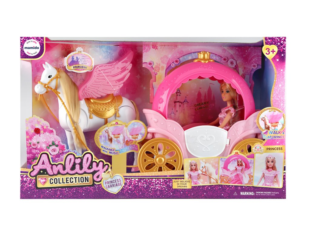 Kúzelná súprava, ktorá premení každú hru na rozprávkové dobrodružstvo. Bábika princezná usadá do ružového kočiaru ťahaného okrídleným Pegasom, ktorý vie chodiť, pohybovať krídlami a prehrávať melódie. Celá súprava očarí svojím detailným spracovaním a svetelnými efektmi, vďaka ktorým sa deti ľahko prenesú do sveta fantázie.