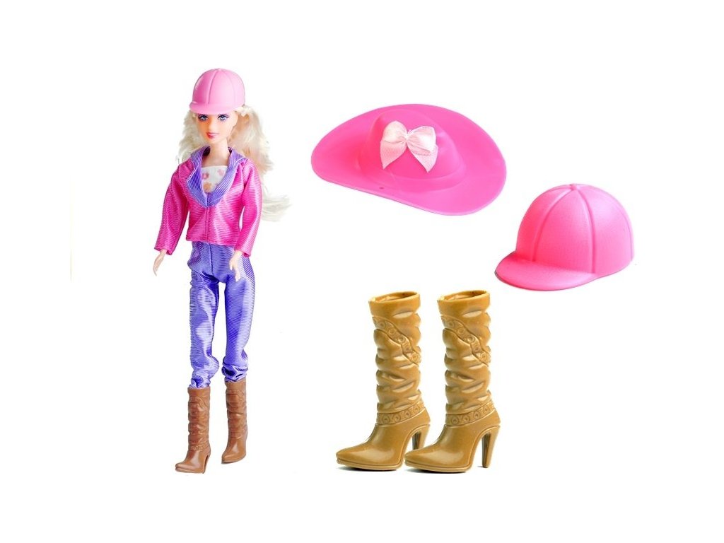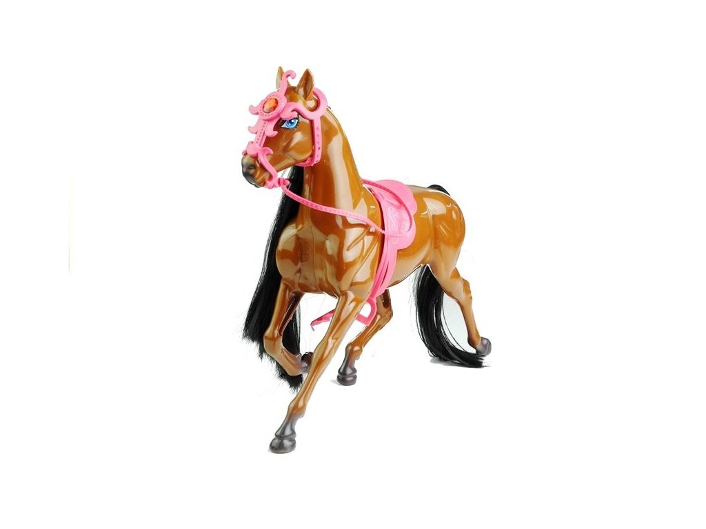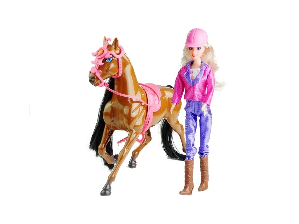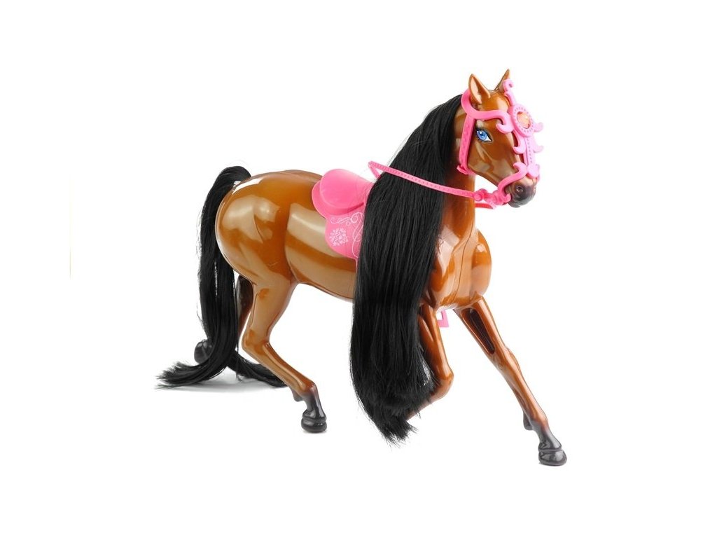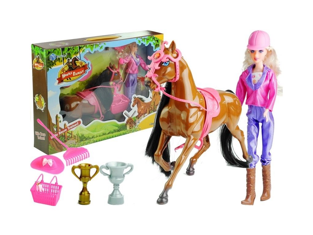 Set, ktorý sa skladá z veľkého hnedého koňa, bábiky a mnohých doplnkov, ktoré sú nevyhnutné pre prácu v stajni. Hnedý kôň impozantnej veľkosti má krásnu hrivu a dlhý čierny chvost, ktorý nielenže svieti, ale je veľmi príjemný na dotyk. Hnedý kôň má mäkké sedlo, ktoré je zdobené elegantnými ornamenty. Tréningová bábika má štíhlu postavu a dlhé, ľahko kučeravé vlasy. Je oblečená v dvojdielnom obleku vyrobenom z lesklého materiálu, ktorý možno okoreniť vysokými podpätkami kovbojských topánok zahrnutých v sade.