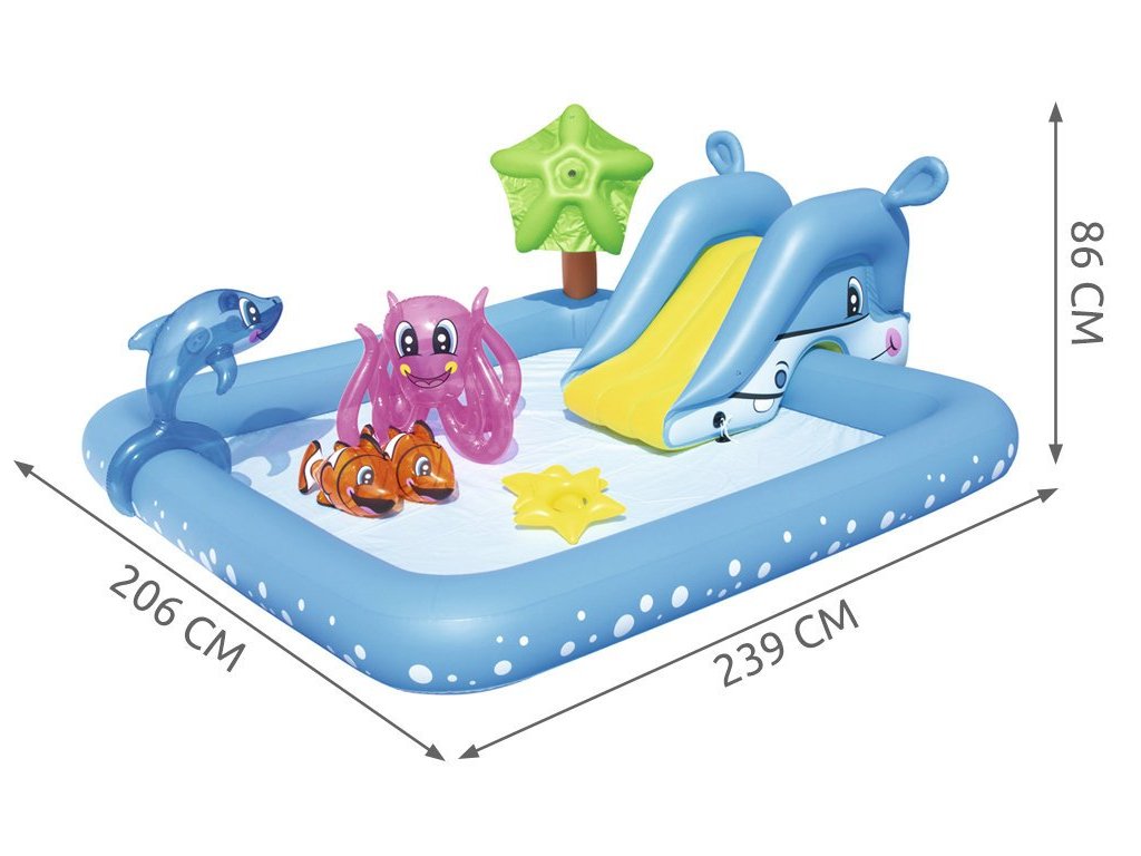 Chcete svojmu dieťaťu poskytnúť nezabudnuteľnú zábavu v súkromí svojej záhrady? Nafukovací bazén - ihrisko z neho urobí skutočné hracie centrum pre vaše dieťa. Bazén s nafukovacími obyvateľmi oceánu, nafukovacie šmýkačkou a vodné fontánou určite poteší vaše malé dieťa a stane sa jeho obľúbeným miestom pre hranie. Bazén je vyrobený z mäkkého, ale odolného materiálu a je čo najbezpečnejšie pre najmenšie deti. Hlavnými atrakciami sú: odnímateľná nafukovacie šmykľavka a palma, z ktorej bude po pripojení záhradnej hadice vytekať voda.