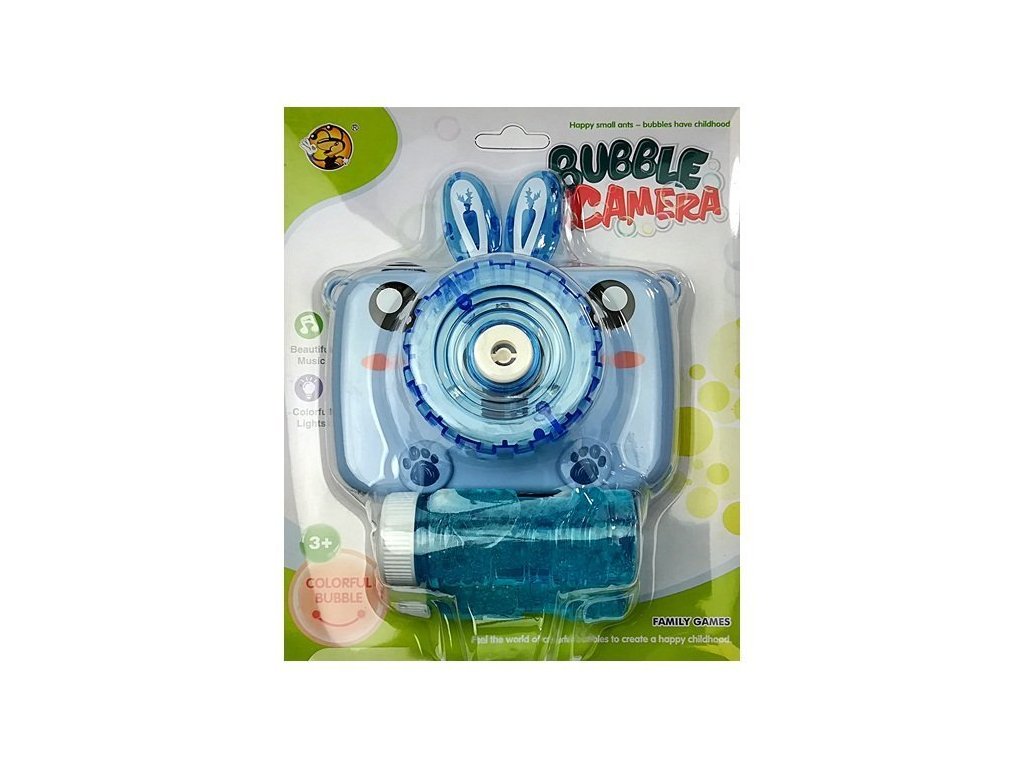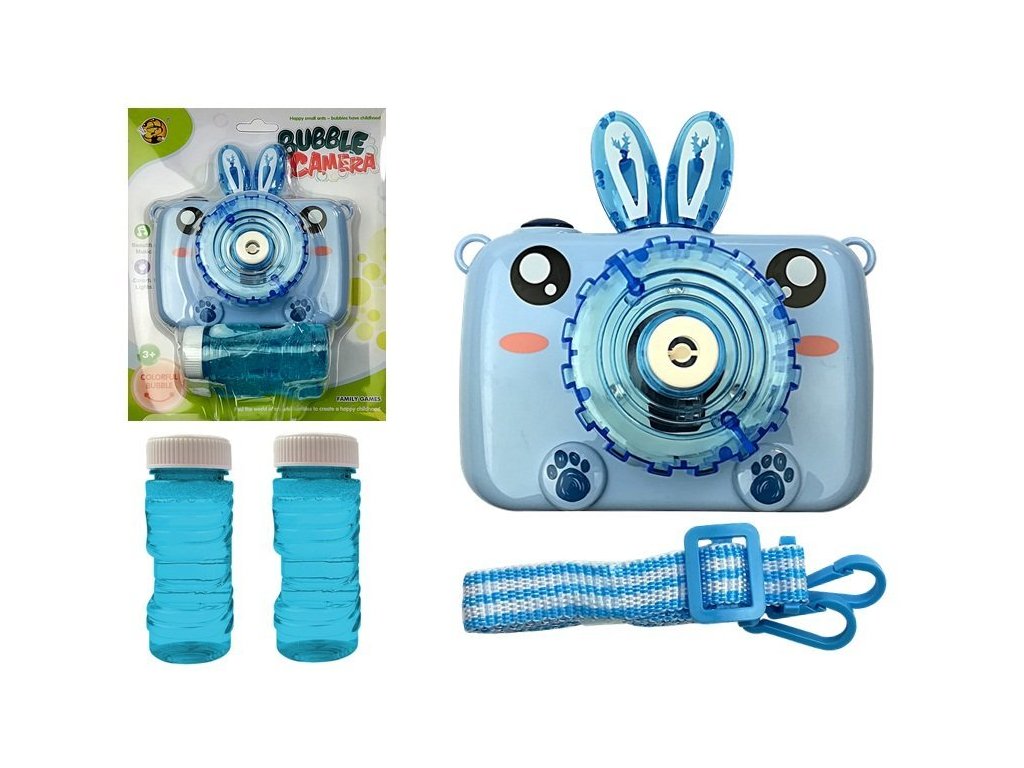 Modrý fotoaparát, ktorý tvorí mydlové bubliny. Perfektný darček pre zábavu v teplých dňoch. Ďalšou výhodou fotoaparátu sú svetelné a zvukové efekty. Stačí naliať tekutinu, stlačiť tlačidlo az fotoaparátu vyletí veľa mydlových bublín. Dodáva sa s popruhom, aby ste ho mohli pohodlne nosiť okolo krku ako skutočný fotoaparát.