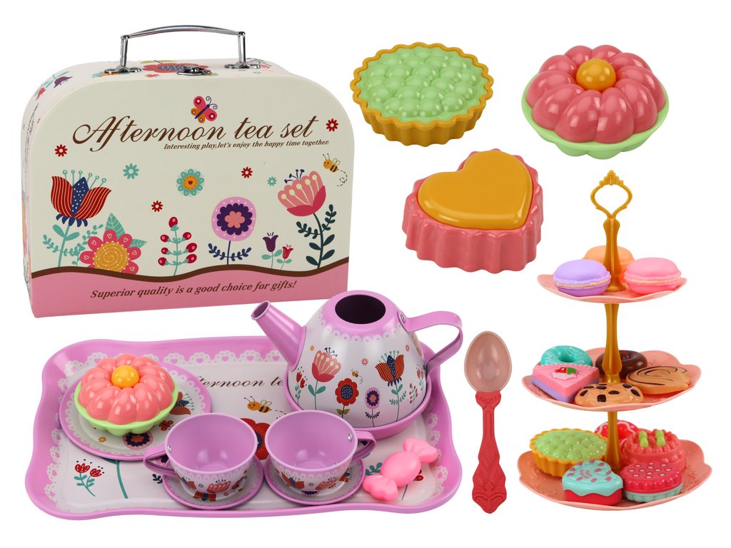 Vnútri kufríka nájdete všetko, čo je potrebné na usporiadanie nezabudnuteľného čajového večierka. Sada sa skladá z maličkých i väčších tanierov, roztomilé čajové kanvičky, šálok, podnosu, stojana na pečivo a rôznych lákavých sušienok. Každý prvok je starostlivo vyrobený a ich farebnosť a vzory sú veľmi atraktívne pre deti, povzbudzujú ich ku kreatívnej hre.