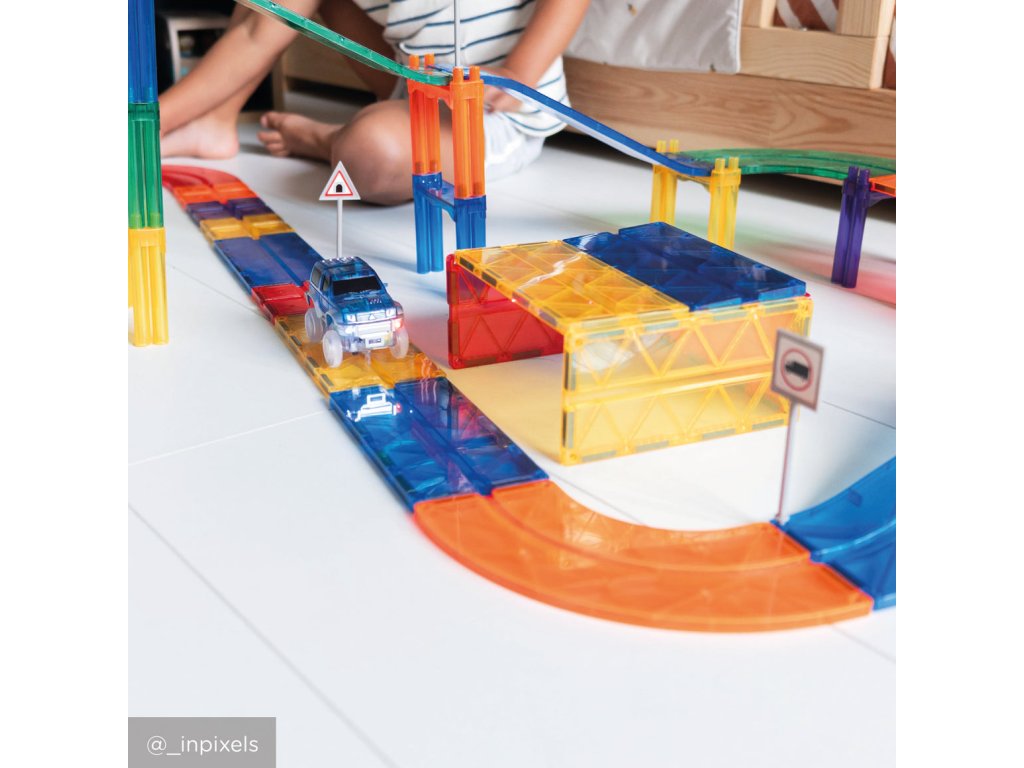 Rozšiřte svou závodní dráhu Cleverclixx o další možnost stavby s touto praktickou sadou Zatáčky k závodní dráze. Obsahuje 15 speciálně tvarovaných magnetických dílků v 3 různých barvách, které umožňují vytvářet plynulé oblouky a rozmanité zatáčky. Díky tomu můžete navazovat na základní 65dílnou sadu a stavět delší, propracovanější a zábavnější dráhy.