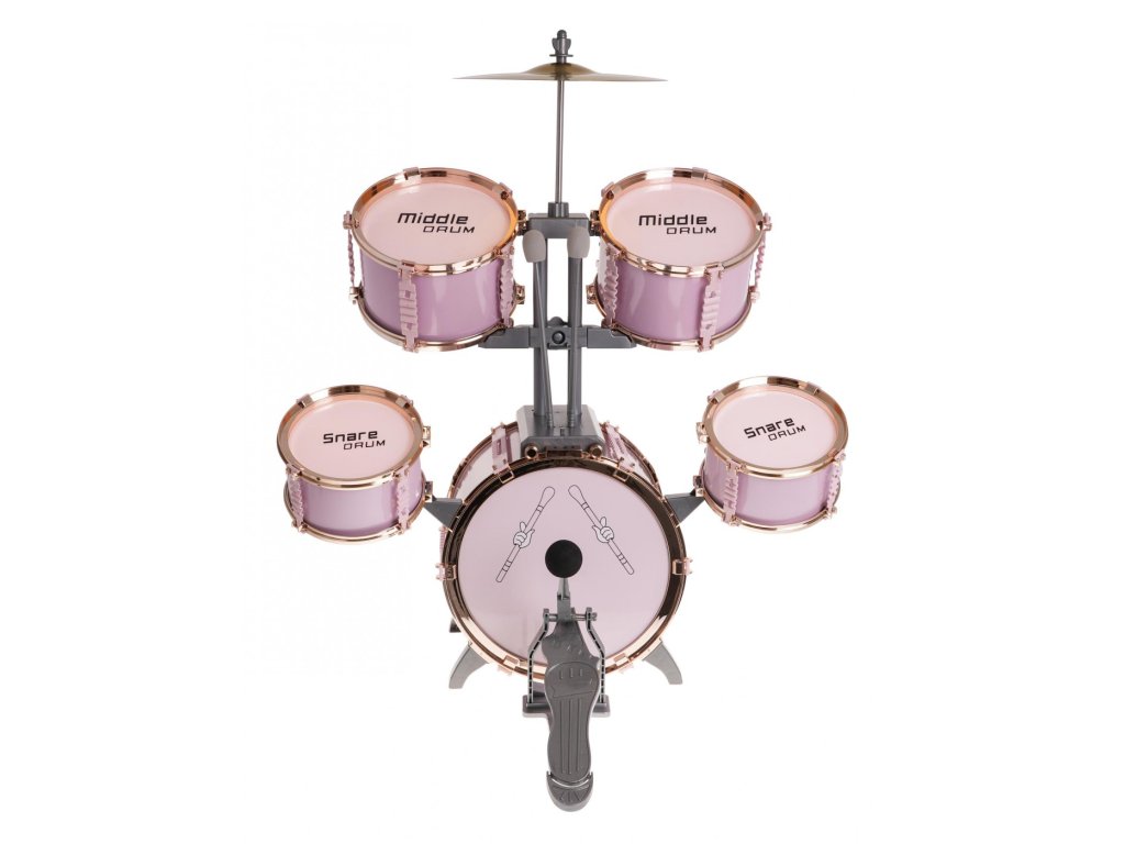 Veľká ružová bicia súprava so stoličkou je hrací nástroj pre deti od 3 rokov . Sada obsahuje 5 bubnov, kovový činel, 2 paličky a stoličku.