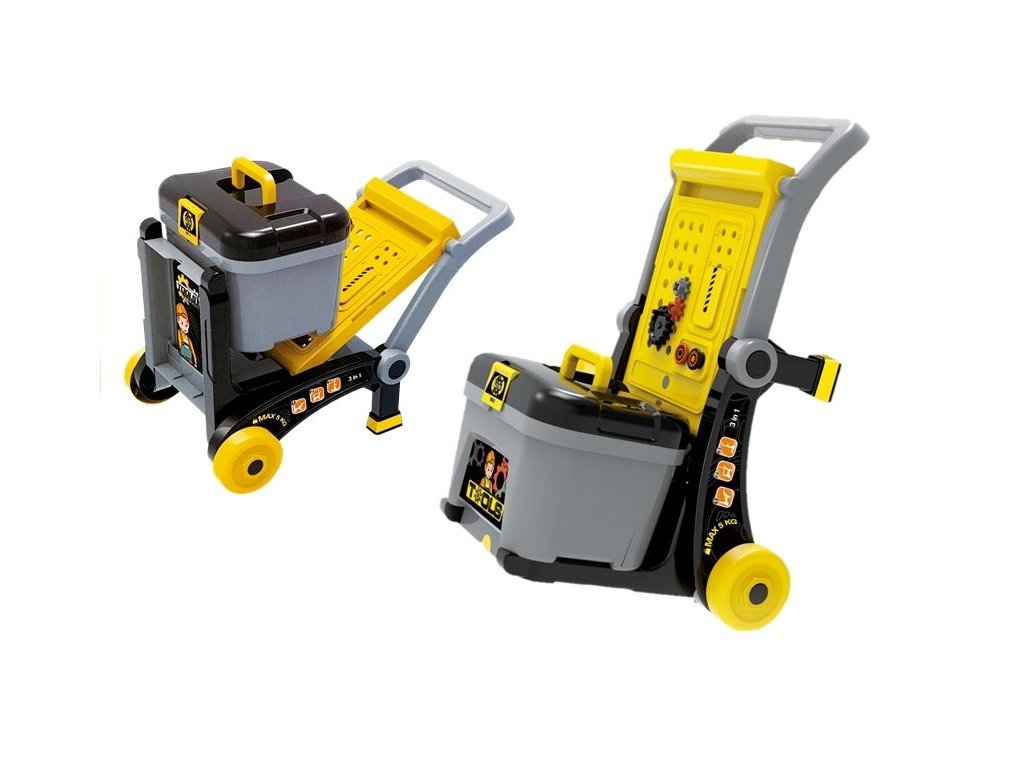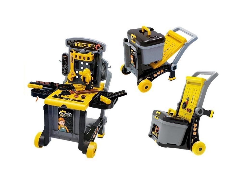 Detská domácej dielni 3v1 sa skladá z veľkého stola s bočnými poličkami, na ktorej ide umiestniť náradie, ktoré sa nachádza v balení. Náradie je možné tiež uschovať do kufríka. Hračka v deťoch podporí rozvoj koordinácie, logického myslenia a kreativity. Hračka má tri možnosti rozloženia - dielňa, vozík a kolieska.