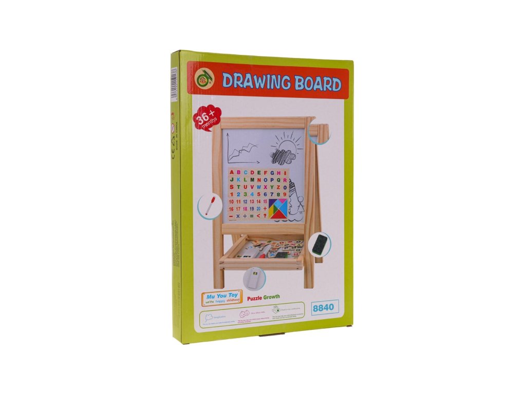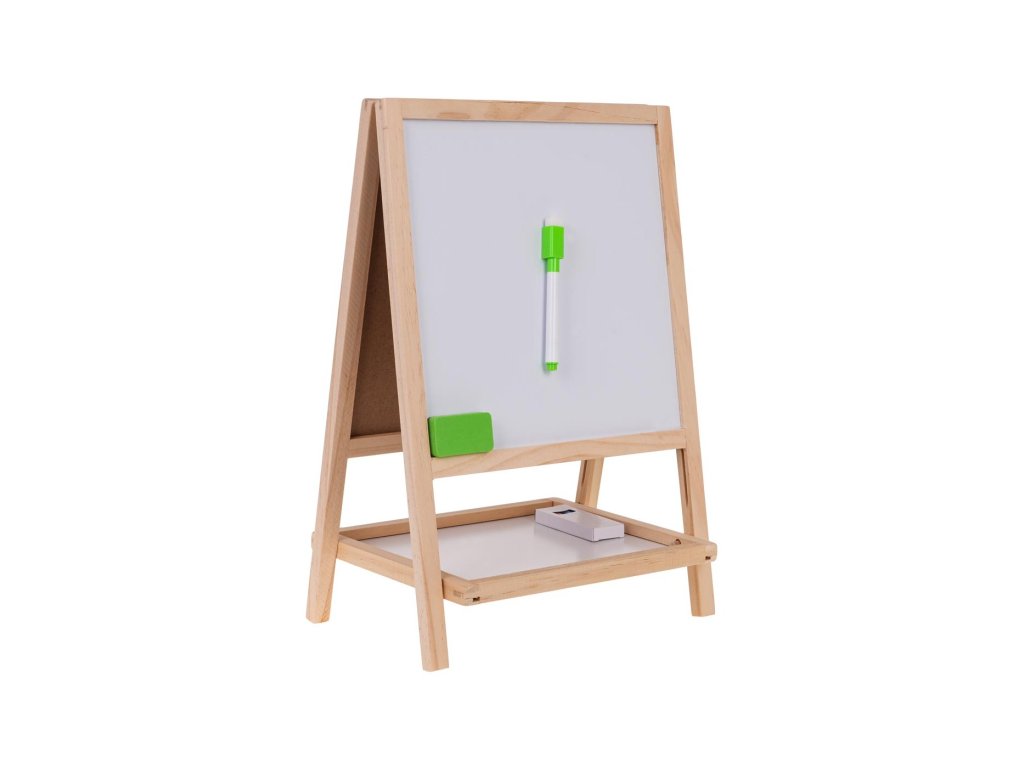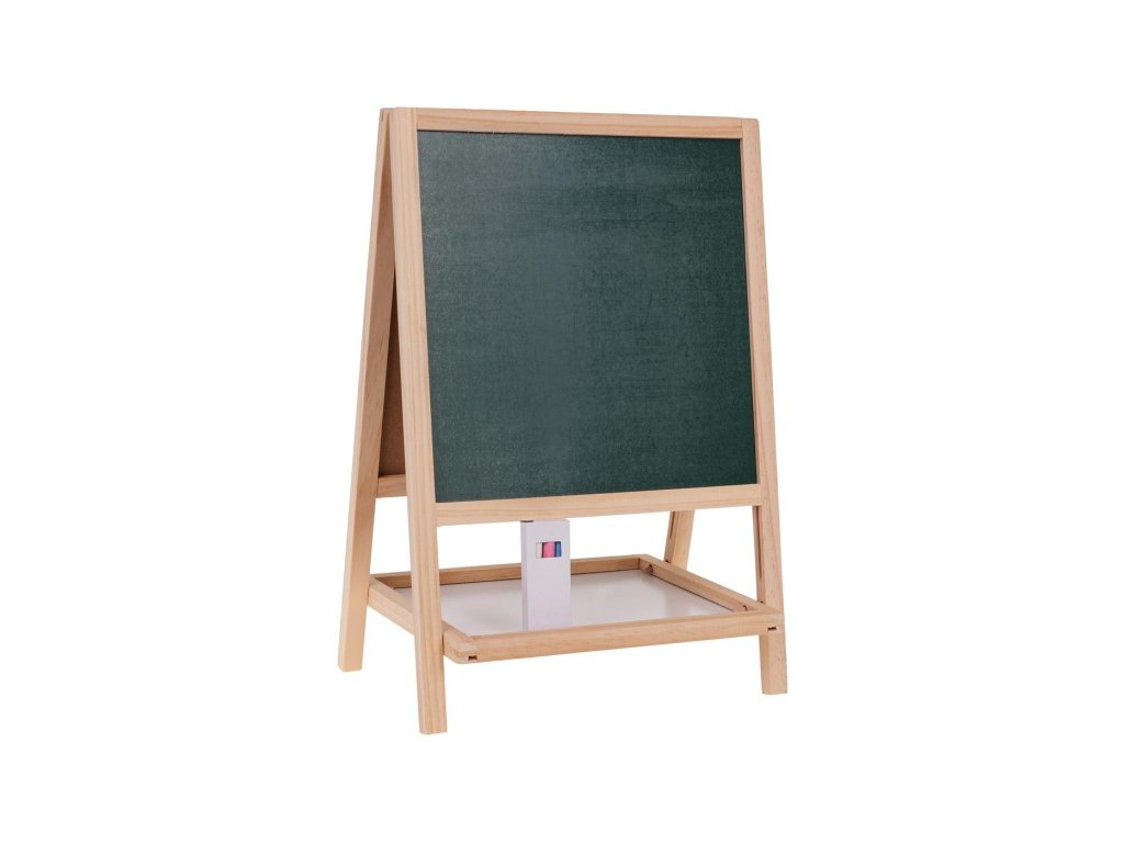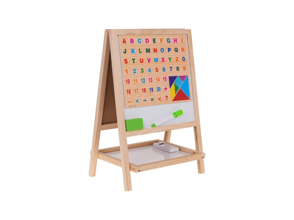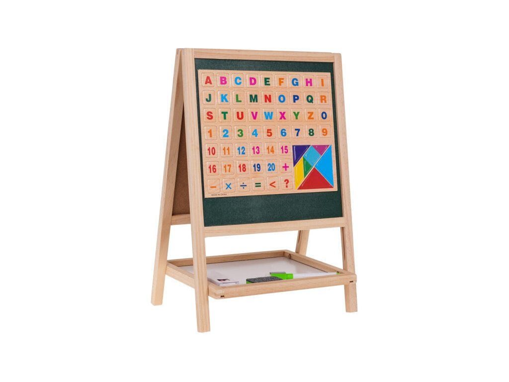 Drevená obojstranná tabuľa s príslušenstvom pre deti od 3 rokov . Tabuľa je z jednej strany biela na maľovanie fixkou, ktorá je súčasťou sady, zatiaľ čo druhá strana je určená na maľovanie kriedami, ktoré sú súčasťou sady. Na bielu aj kriedovú stranu tabule môžeme pripevniť magnety. Súčasťou sady sú magnetky s písmenami, číslicami, matematickými operáciami a priestorovými obrazcami. Sada je v spodnej časti vybavená praktickou poličkou na uloženie všetkého príslušenstva.