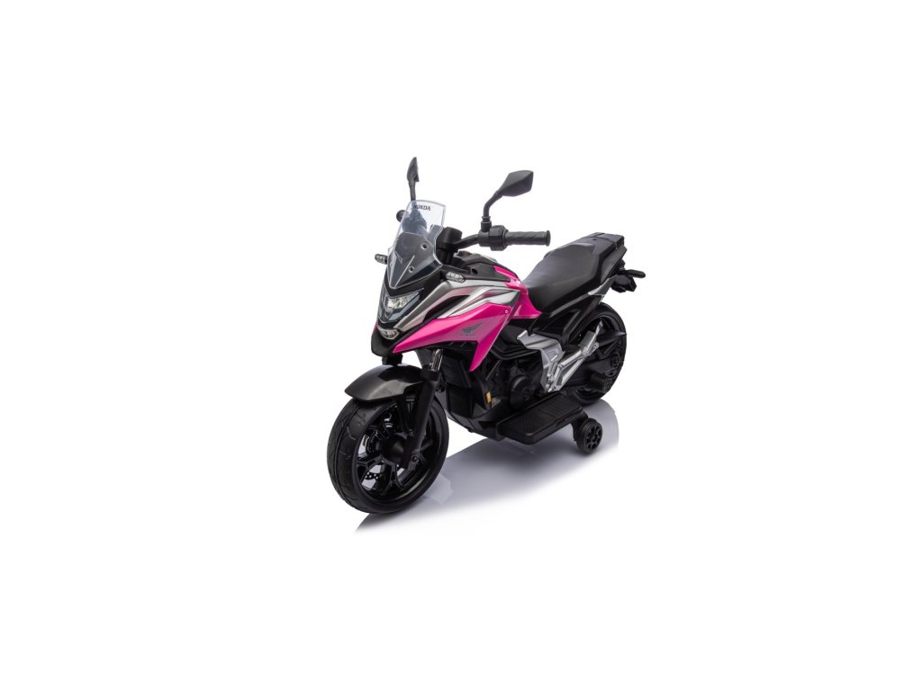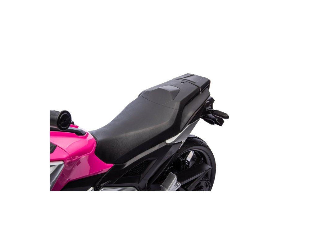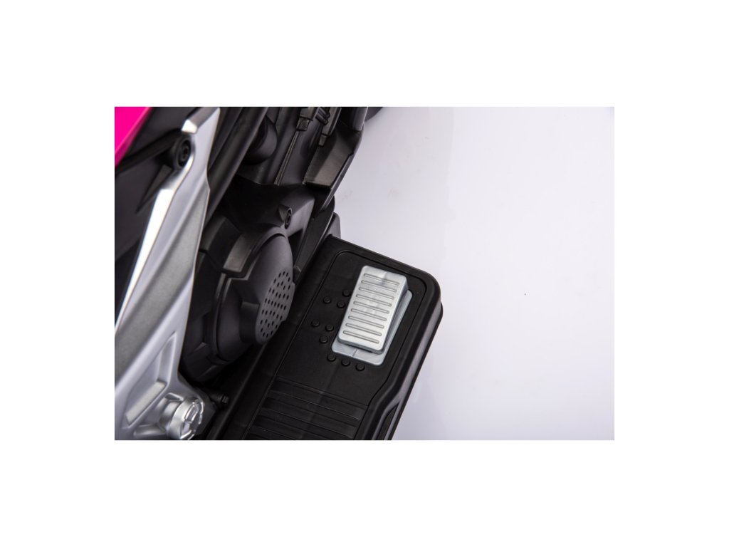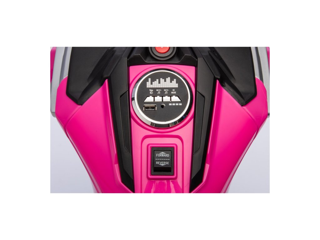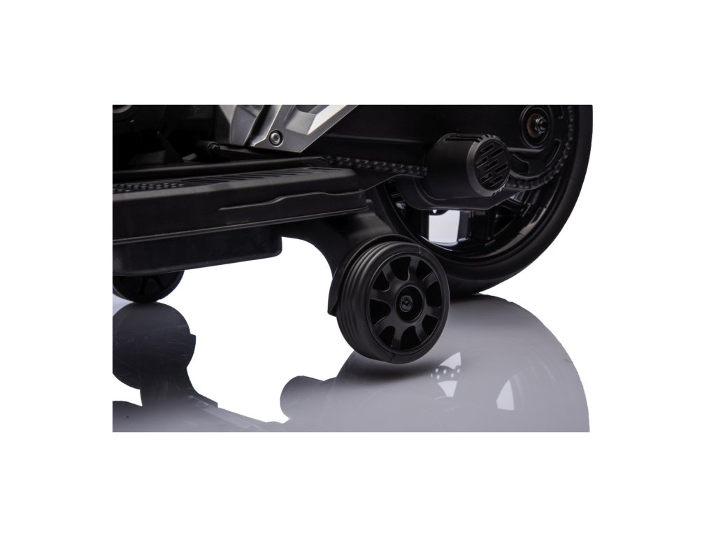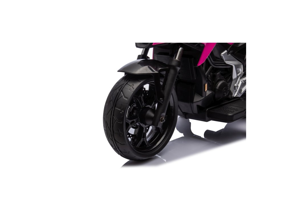 Detská elektrická motorka má plastové kolesá s gumovým lemom a motor s výkonom 70W . Medzi vybavenie patria predné LED svetlá a hudobný panel s Bluetooth, AUX, MP3, USB a vopred nahranými melódiami.
