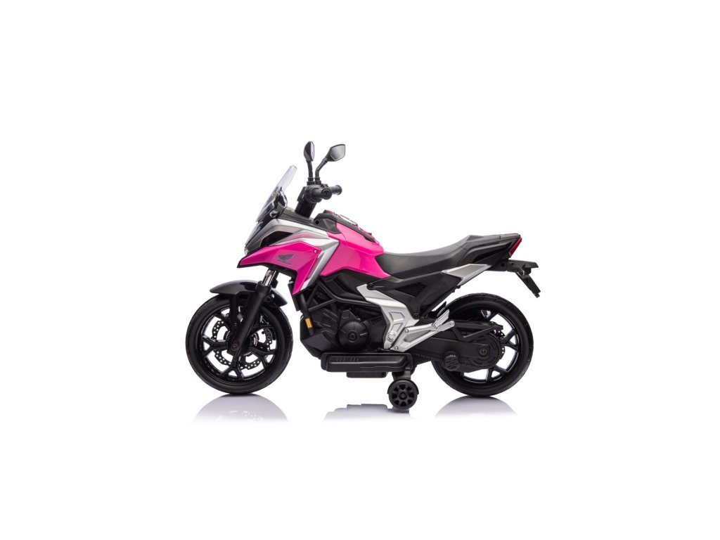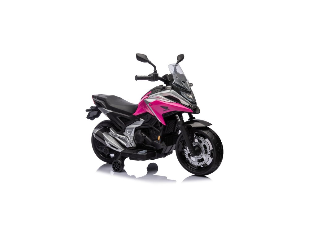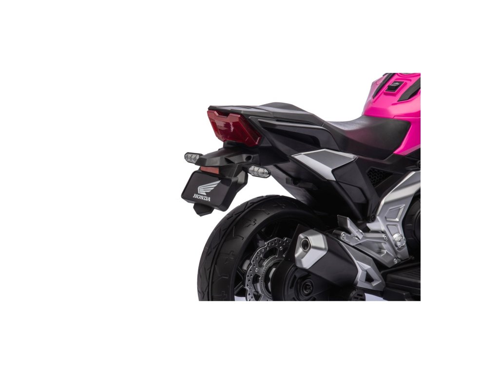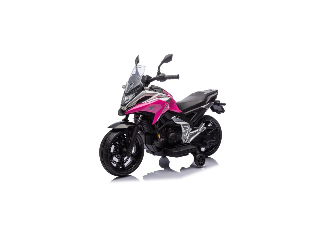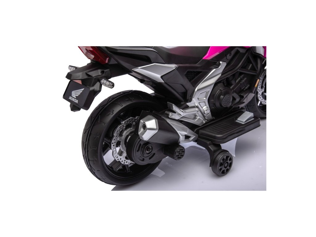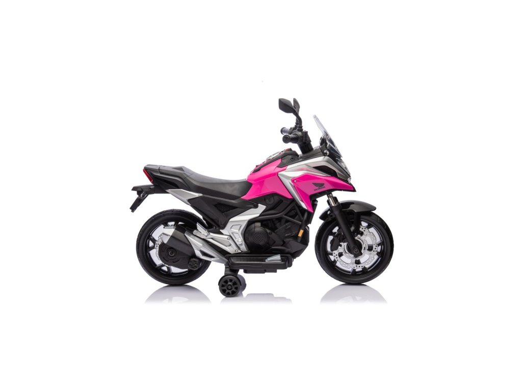 Detská elektrická motorka má plastové kolesá s gumovým lemom a motor s výkonom 70W . Medzi vybavenie patria predné LED svetlá a hudobný panel s Bluetooth, AUX, MP3, USB a vopred nahranými melódiami.