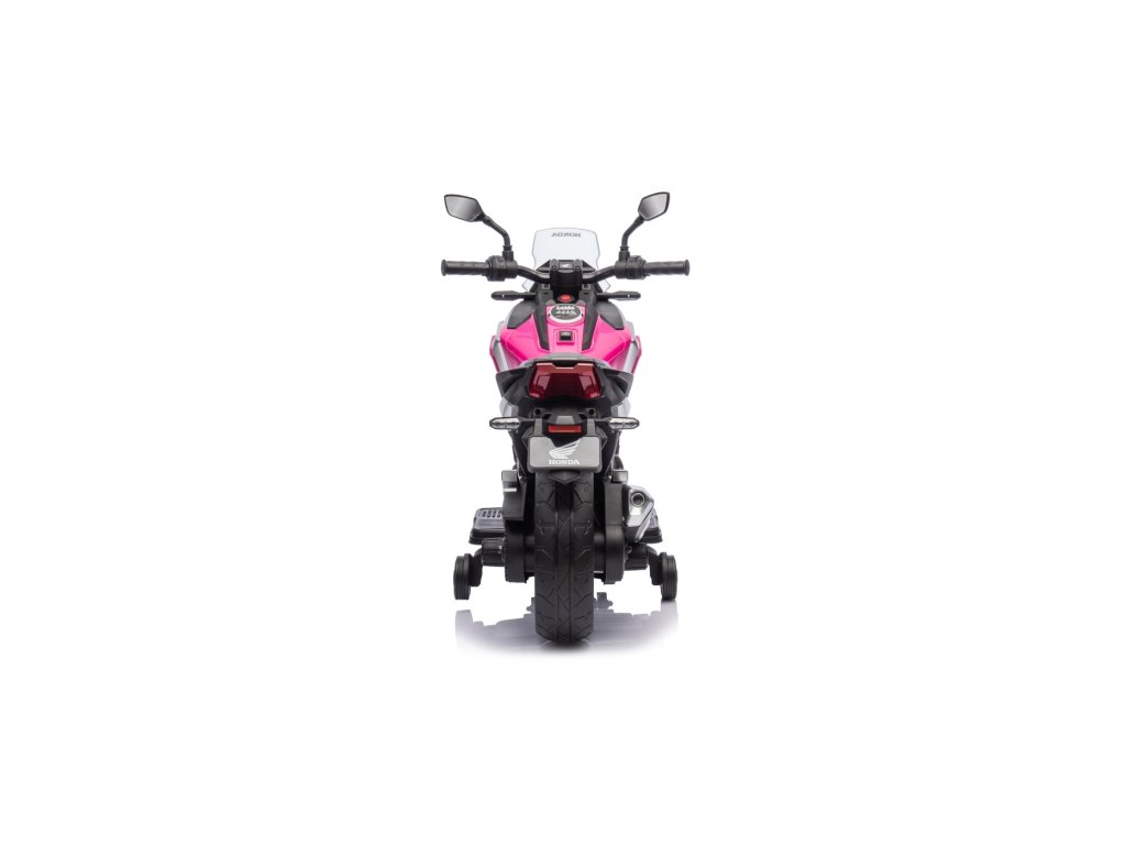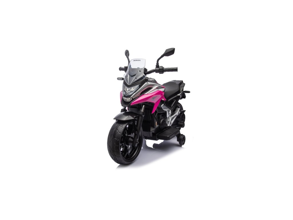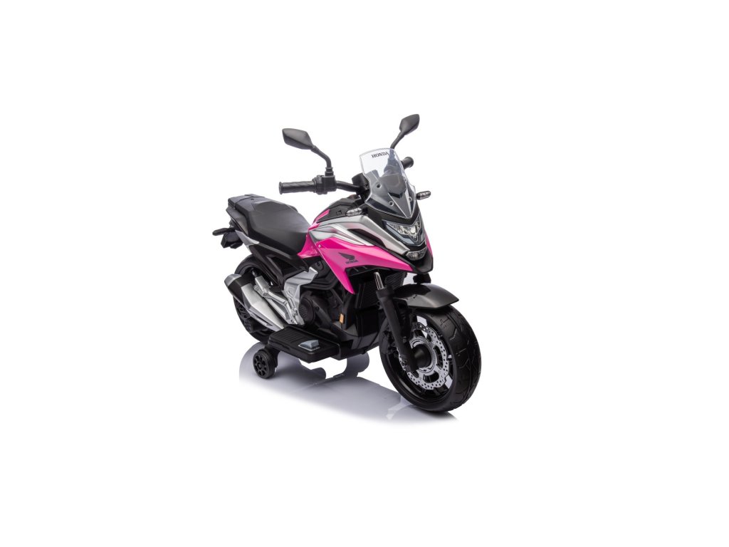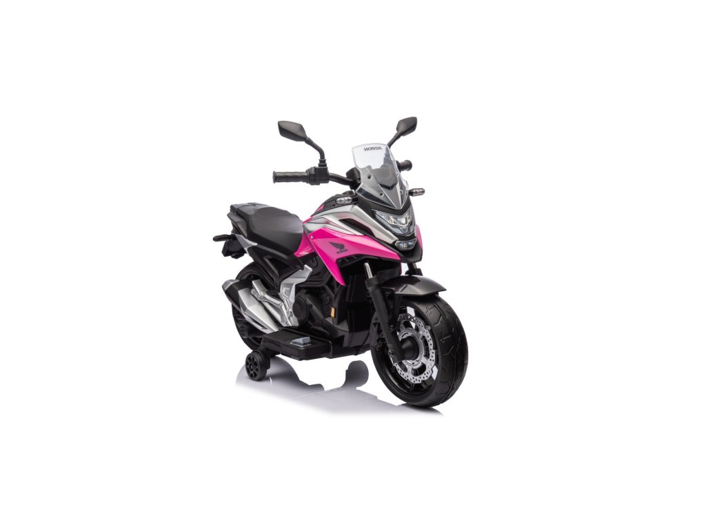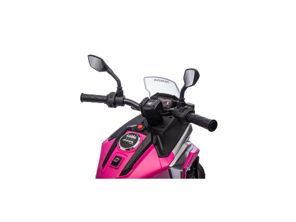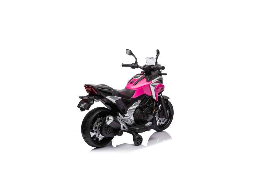 Detská elektrická motorka má plastové kolesá s gumovým lemom a motor s výkonom 70W . Medzi vybavenie patria predné LED svetlá a hudobný panel s Bluetooth, AUX, MP3, USB a vopred nahranými melódiami.
