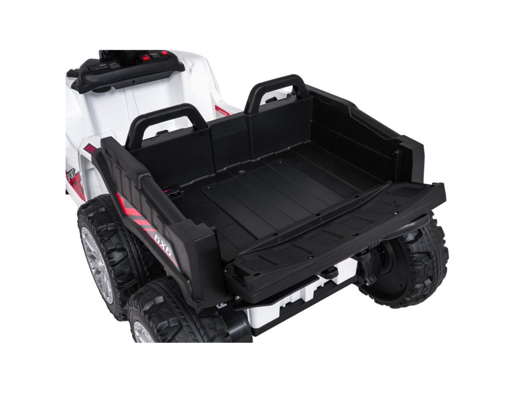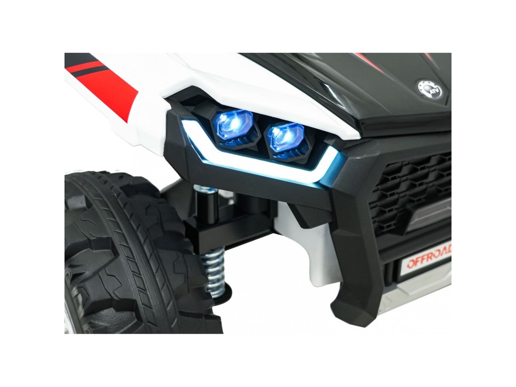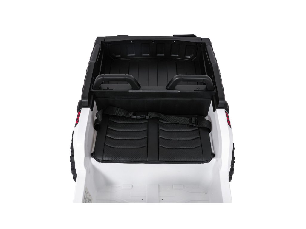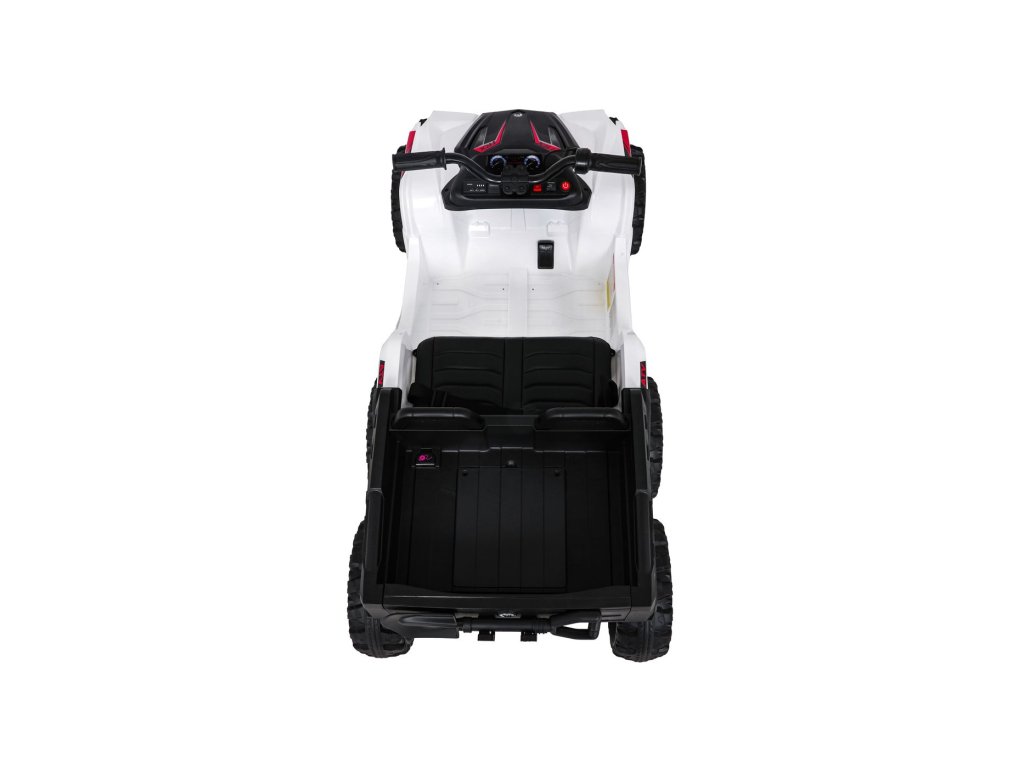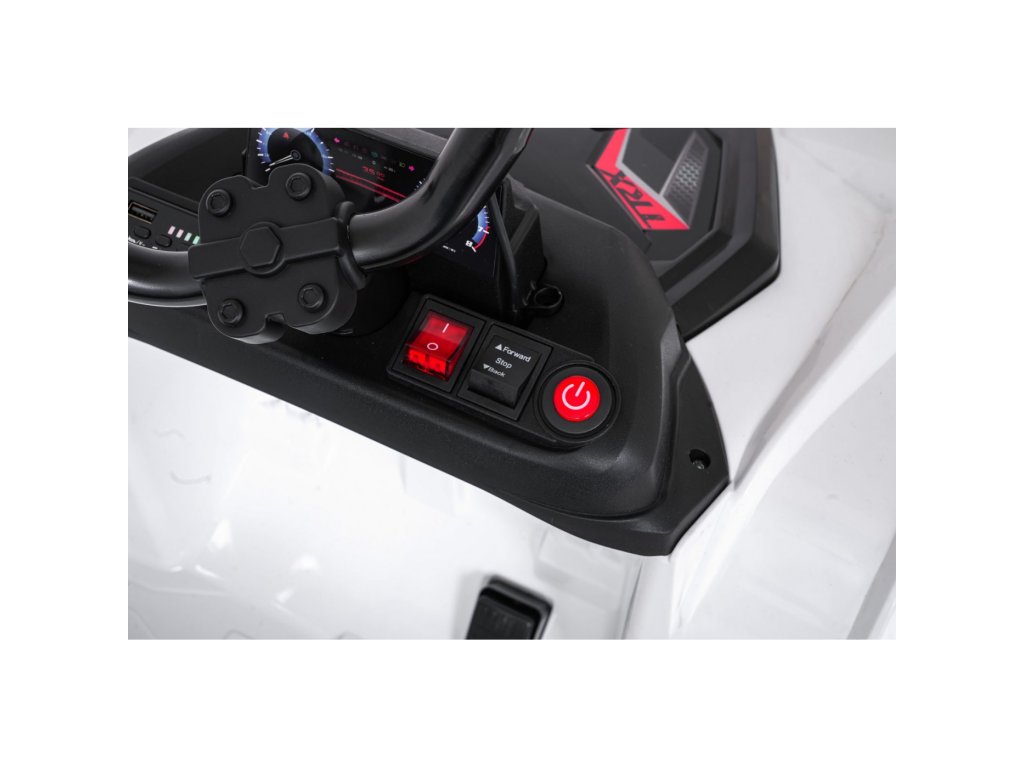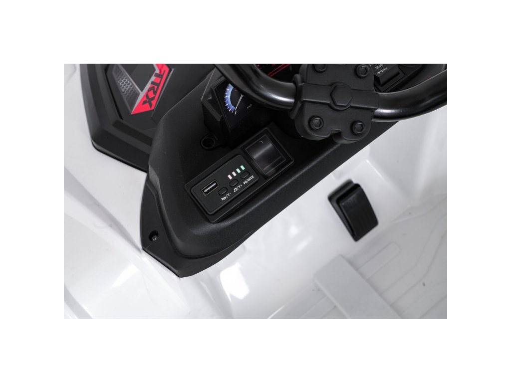 Súčasťou výbavy sú aj predné LED svetlá, otvárateľné dvere a priestranný kufor s rozmermi 42 x 28 x 10 cm. Hudobný panel ponúka MP3 prehrávač, Bluetooth, USB vstup a tlačidlá s melódiami a klaksónom priamo na volante. Indikátor nabitia batérie umožní mať neustále prehľad o stave vozidla.