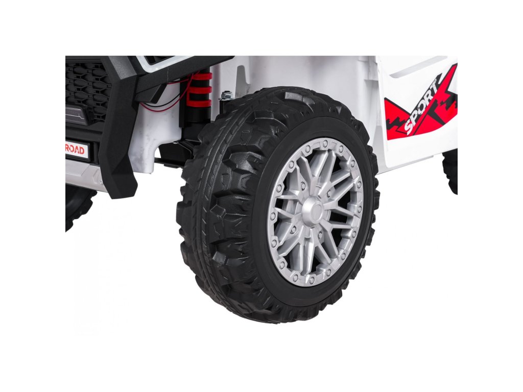 Štvorkolka je vybavená tichými penovými EVA kolesami s rozmerom 26 x 11 cm a odpružením vpredu aj vzadu, čo zaisťuje pohodlnú a stabilnú jazdu aj na nerovnom teréne. O bezpečie dieťaťa sa starajú bezpečnostné pásy a robustná sedačka z čiernej ekologickej kože.