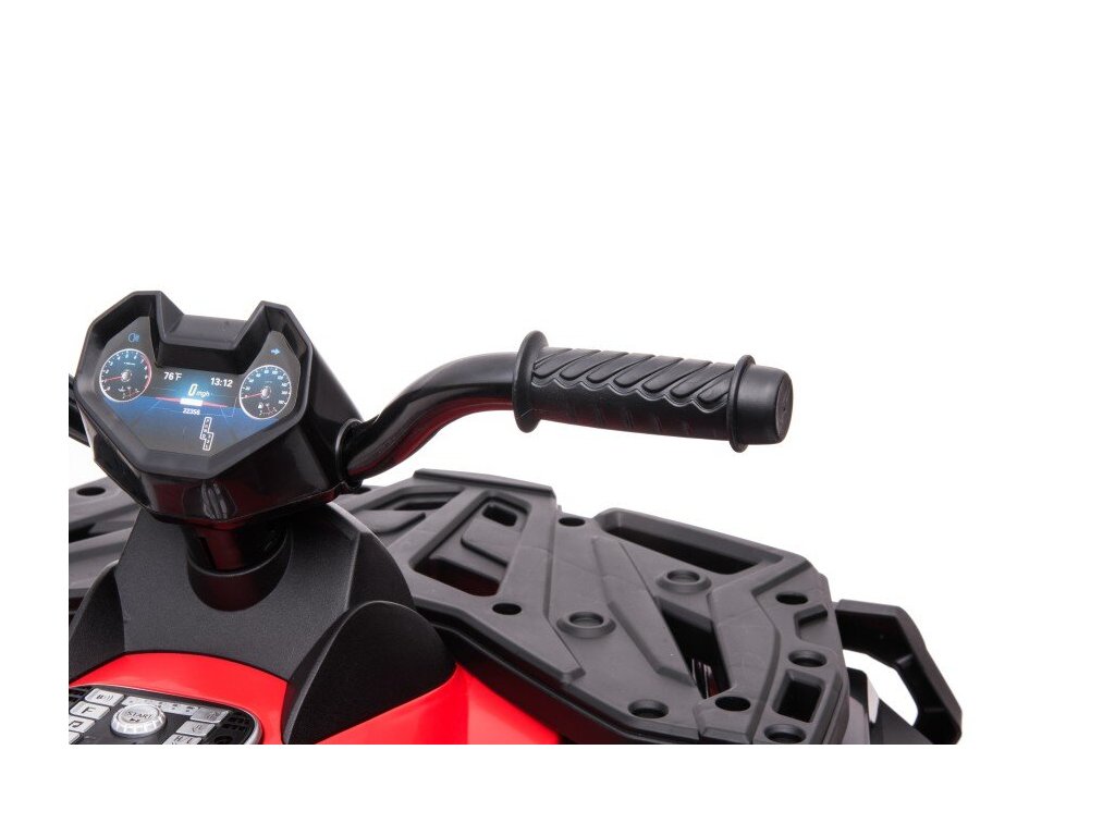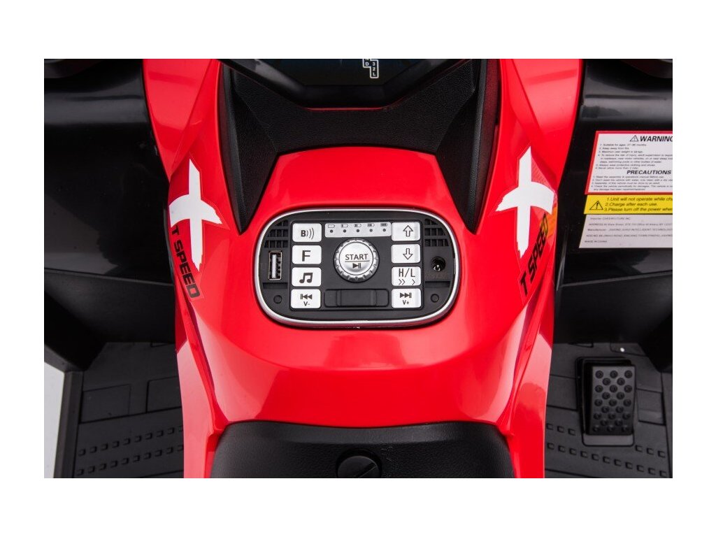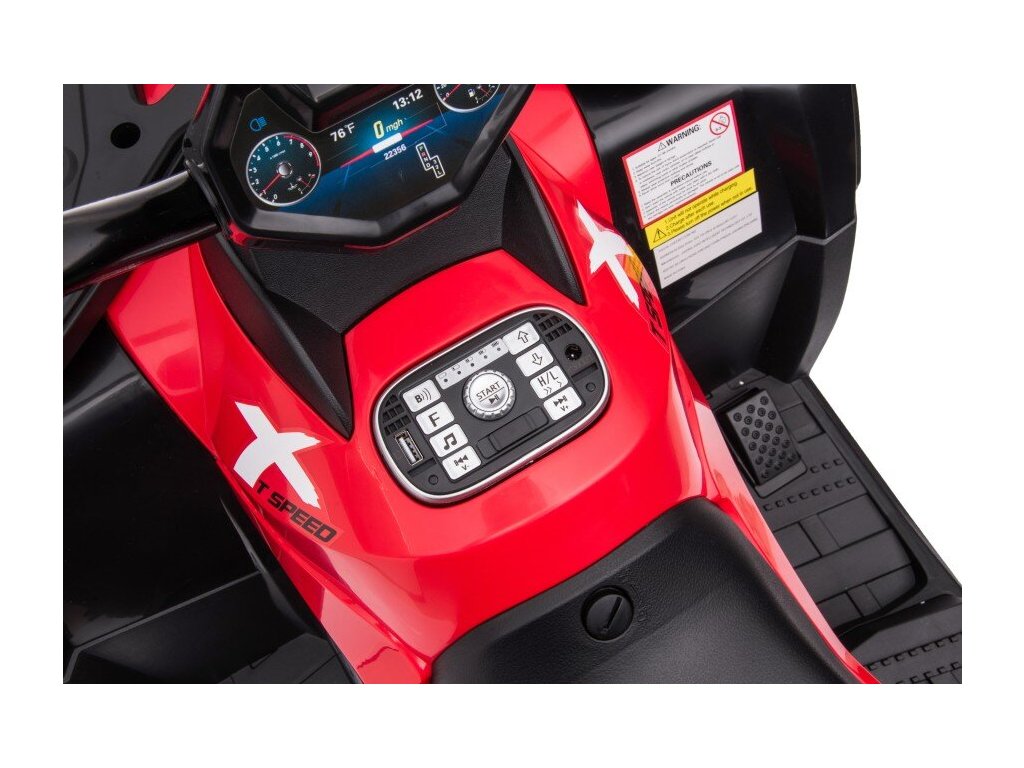 Medzi vybavenie patrí hudobný panel s USB, Rádiom, Bluetooth a vopred nahranými melódiami. Štvorkolka má predné svetlá , umožňuje jazdu vo všetkých smeroch a jej nosnosť je do 59 kg .