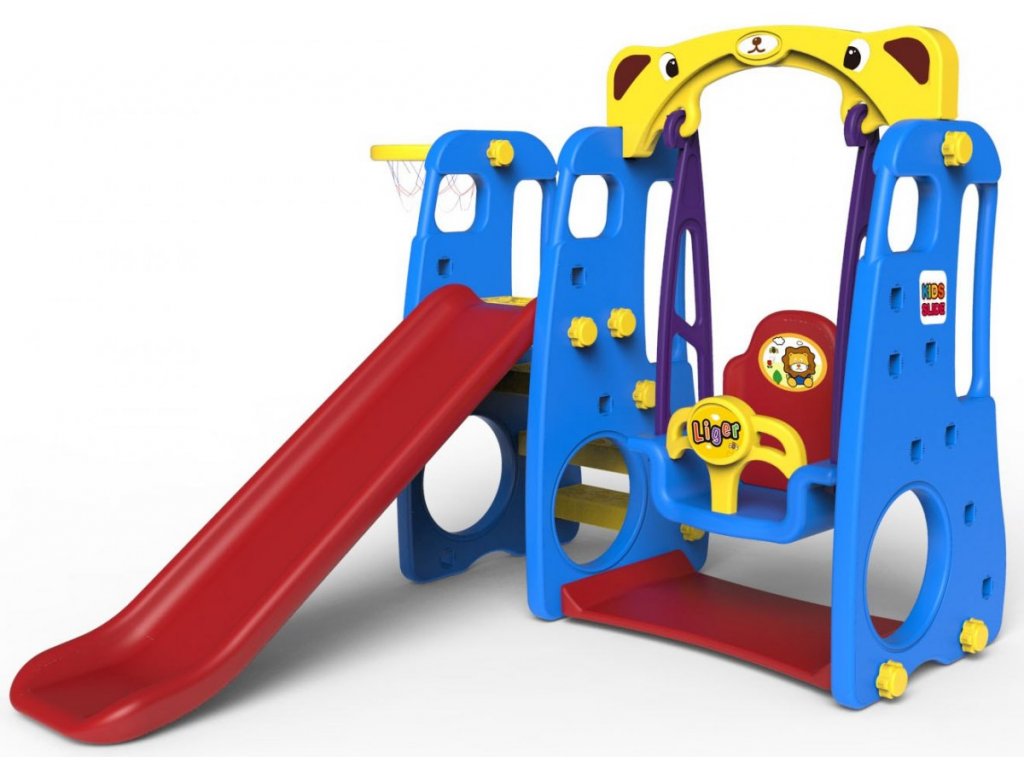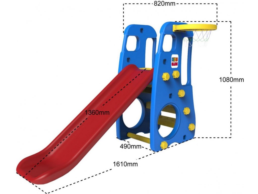 Záhradná hojdačka so šmýkačkou a basketbalovým košom. Zostava možno zložiť dvoma spôsobmi, s košom po pravej alebo po ľavej strane. Šmýkačku možno polohovať v závislosti od veku dieťaťa. Zostava je vhodná do interiéru aj na záhradu. Všetky steny a komponenty sú vyrobené z dvojitej vrstvy plastu. Vhodná veková kategória od 1 roka. Výrobok má európsky certifikát bezpečnosti CE.