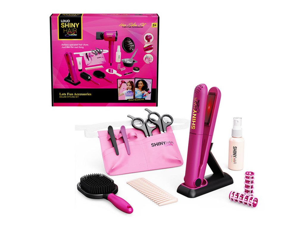 Staň sa skutočnou kaderníčkou s kompletnou súpravou Shiny Hair Salon! Táto luxusná stylingová súprava prináša realistický zážitok zo salónu krásy – súčasťou je funkčný fén na batérie, ktorý fúka vzduch, a žehlička na vlasy so svetelným efektom. Vďaka bohatej výbave môžu deti vytvárať nekonečné účesy a precvičovať svoju kreativitu aj jemnú motoriku.
