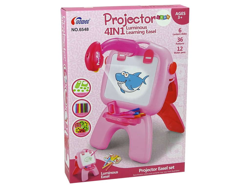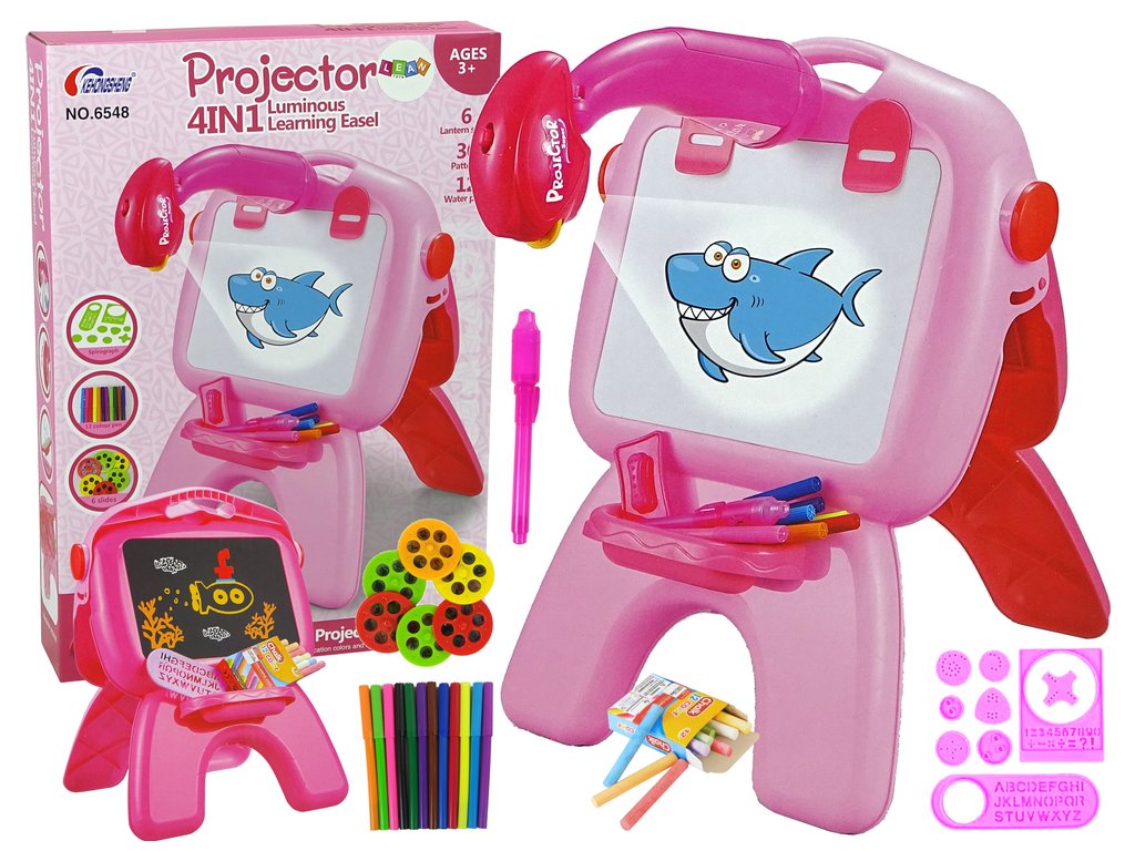 Obojstranná tabuľa s osvietením sa dá zložiť na dve strany. Má dve kresliace plochy. Biela, pre použitie s mazatelnými fixkami a čierna, pre kresbu kriedou. Môže byť umiestnená kdekoľvek v miestnosti. Okrem toho má miesto, do ktorého môžete vložiť fixky a ďalšie pomôcky pre kreslenie. Projektor v hornej časti zobrazuje rôzne obrázky so zvieratami a postavami, ktoré možno prekresliť na povrch tabule. Šablóny v sade naučí vaše dieťa správne názvy geometrických obrazcov a písania písmen.