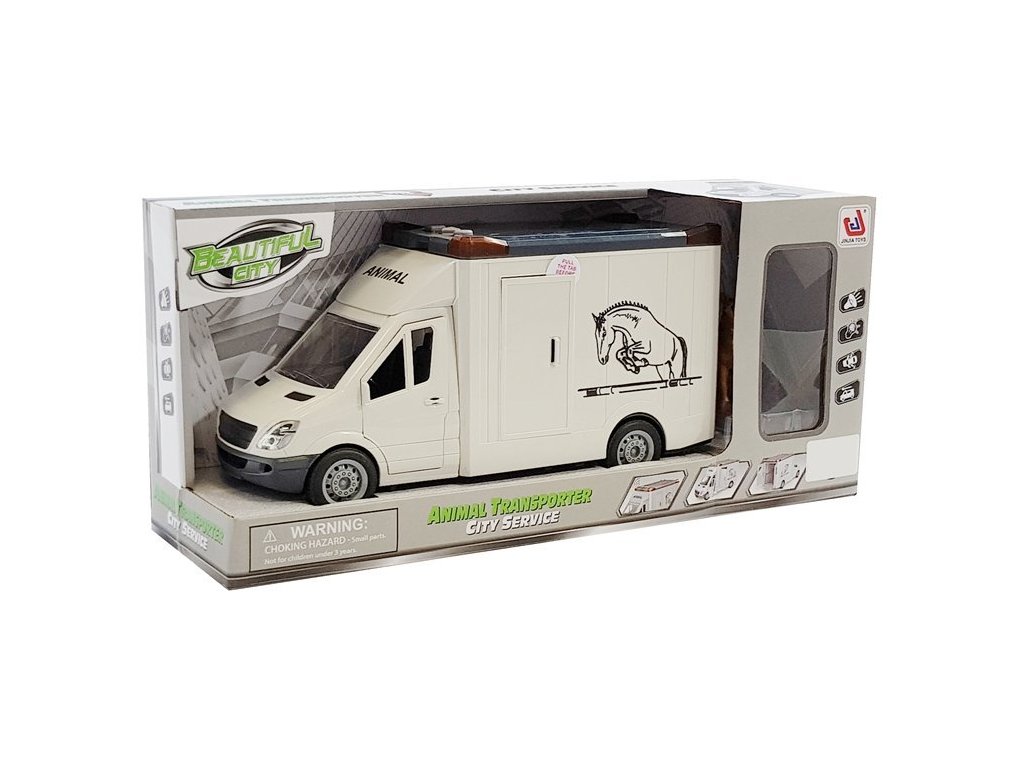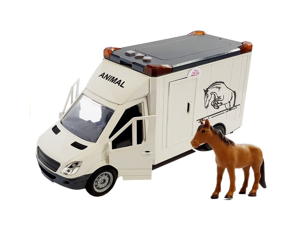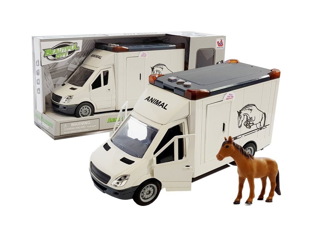 Autíčko na prepravu koní má zvukové a svetelné efekty, ktoré sa aktivujú tlačidlami umiestnenými na streche volantu. Autíčko je poháňané trecím pohonom. Vozidlo má bočné a zadné dvere, ktoré sa otvárajú. Na streche sa nachádza poklop, ktorý sa dá otvoriť. V balení sa nachádza figúrka koňa.
