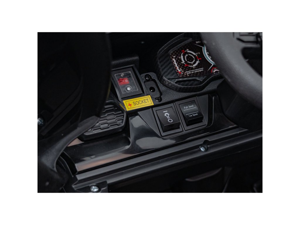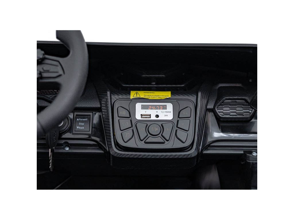 Súčasťou výbavy je bohatý multimediálny panel s rádiom FM, MP3, USB, AUX a Bluetooth. Rodičia majú plnú kontrolu vďaka diaľkovému ovládaču 2,4 GHz s tromi rýchlosťami a bezpečnostným tlačidlom STOP.