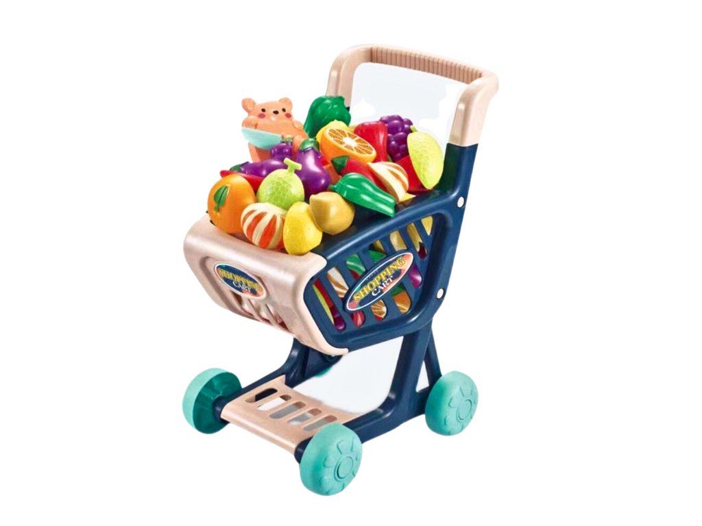 Detský nákupný vozík s potravinami na rozkrojenie - tmavomodrý