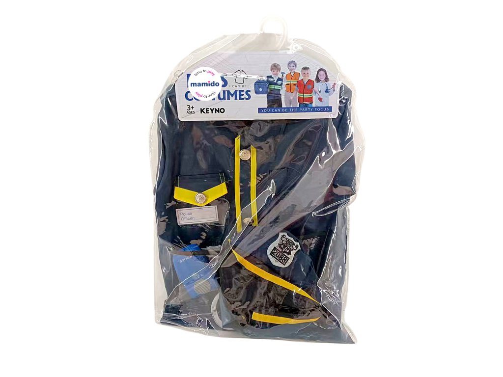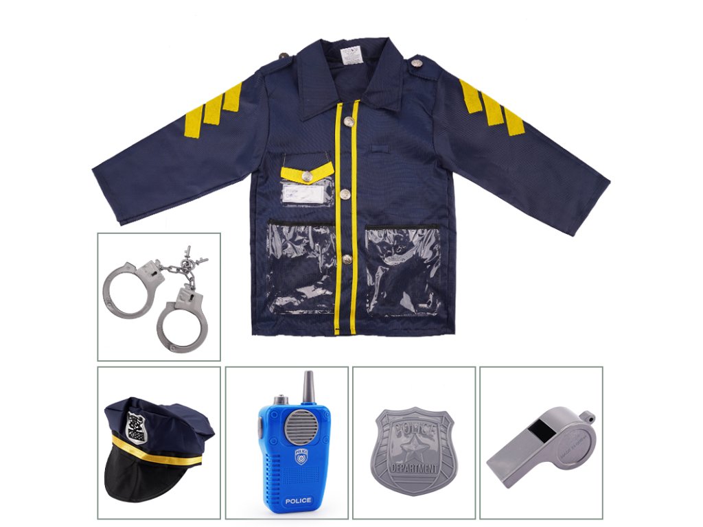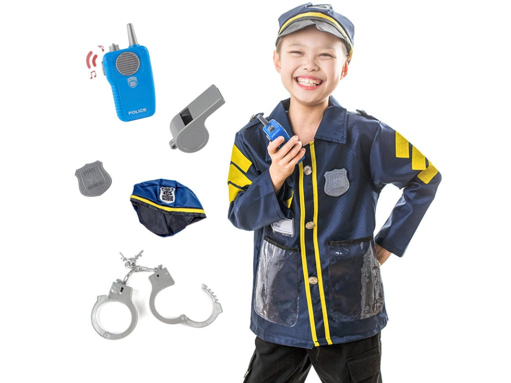 Staň sa skutočným ochrancom poriadku! Tento policajný kostým pre deti obsahuje realistickú bundu s dlhým rukávom a žltými pruhmi, čiapku aj súpravu nevyhnutných doplnkov. Najväčšiu zábavu zaistí funkčná hudobná vysielačka, s ktorou budú malí strážcovia zákona pripravení na akciu. Súčasťou je tiež odznak, putá, píšťalka a ďalšie príslušenstvo, ktoré deťom pomôže vžiť sa do role. Ideálne pre hry na policajtov, maškarné plesy, oslavy aj domáce zábavu.