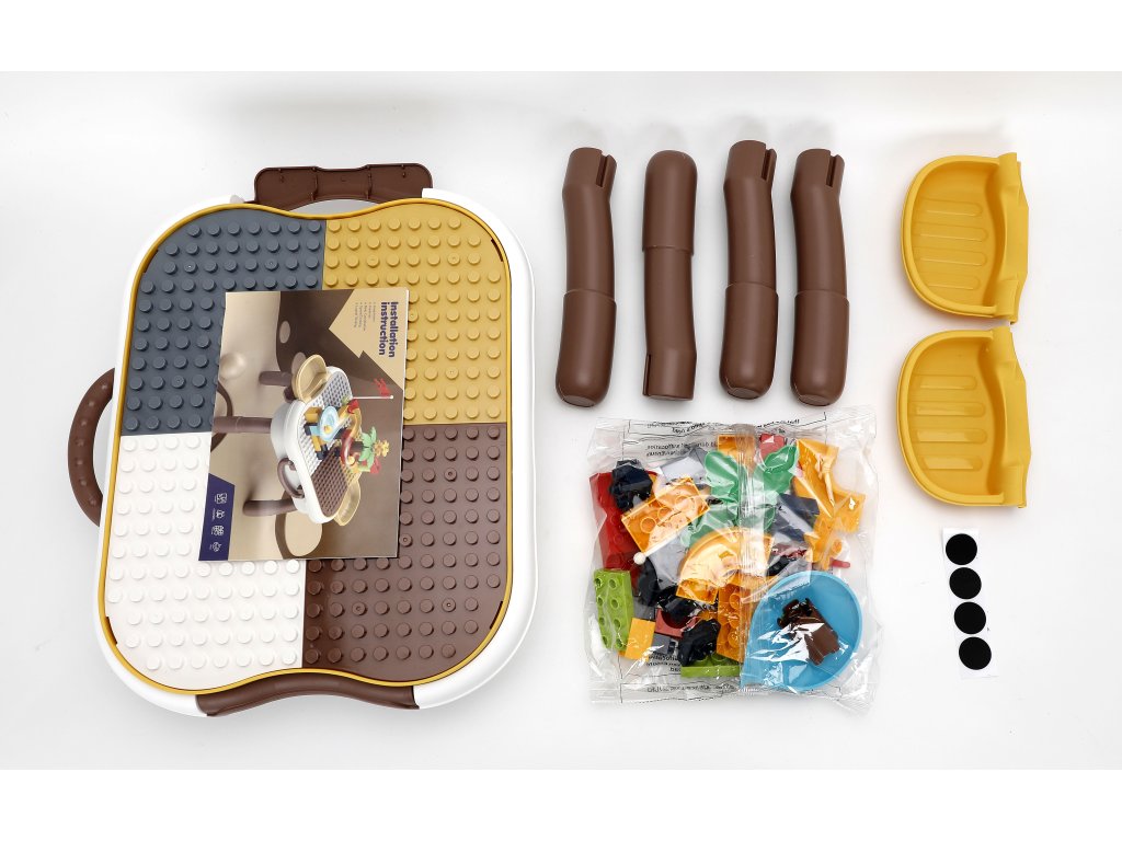 Súčasťou je súprava farebných kociek a dielikov, z ktorých deti môžu stavať dráhy pre guličky, veže alebo ďalšie kreatívne stavby. Stolček podporuje rozvoj fantázie, jemnej motoriky a logického myslenia.