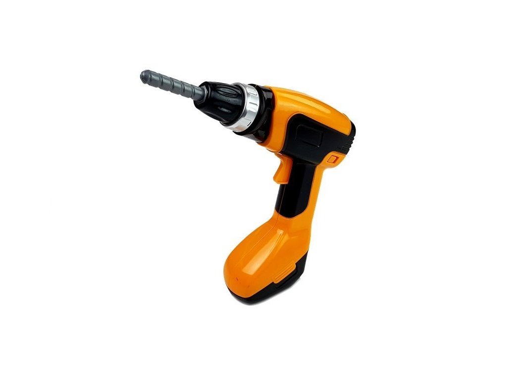 Dvojúroveňová dielňa pojme všetky potrebné príslušenstvo. Vrták je napájaný batériami. Má funkciu skrutkovania a oskrutkovania.