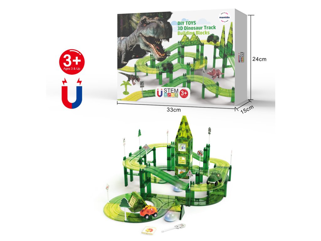 Objavte svet plný dobrodružstiev s dráhou pre dinosaurích pretekárov, ktorá kombinuje kreatívne magnetické stavebnice a akčné svietiace autíčka v tvare dinosaurov. Deti si môžu samy postaviť až 164 rôznych častí dráhy, vytvárať tunely, mosty aj zákruty a sledovať, ako autíčka svietia a prechádzajú ich výtvormi.