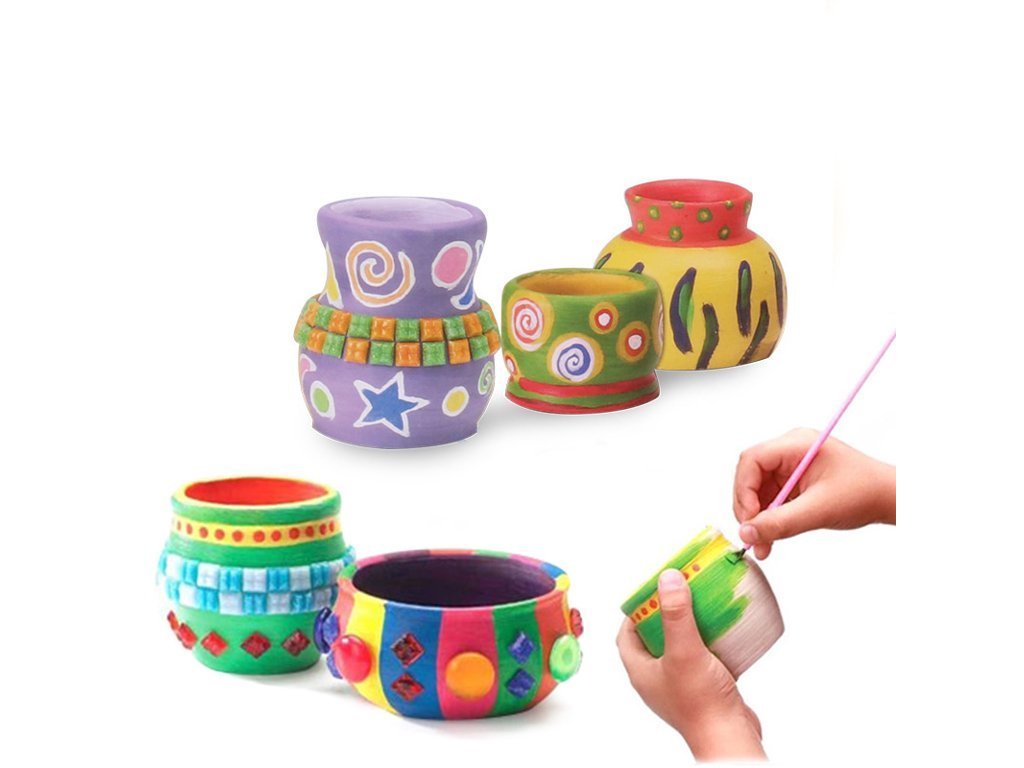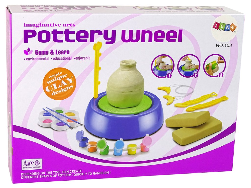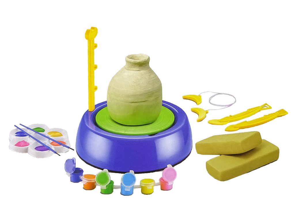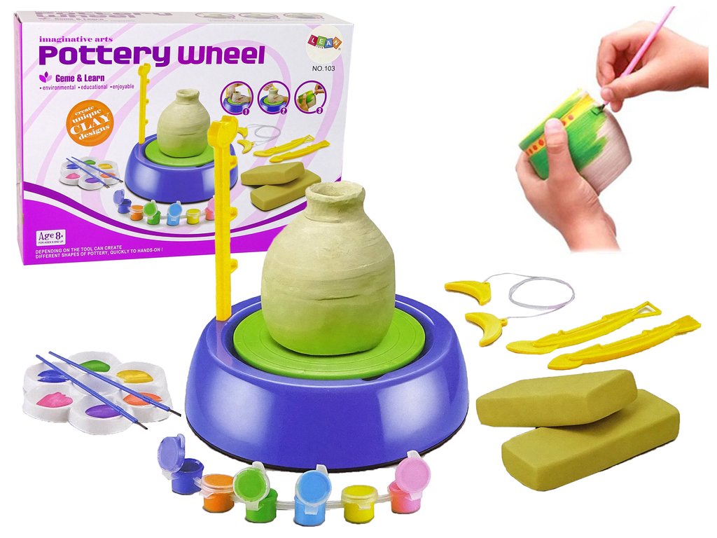 S farbami obsiahnutými v sade môžete maľovať krásne vytvorené kvetináče, škála farieb vám dá možnosť vytvoriť farebné diela podľa vlastnej fantázie. Hrnčiarsky kruh je napájaný batériami . Na hračke sú dve rýchlosti otáčania. Vlastnými rukami si môžete vymodelovať džbán alebo tanier, pohár.
