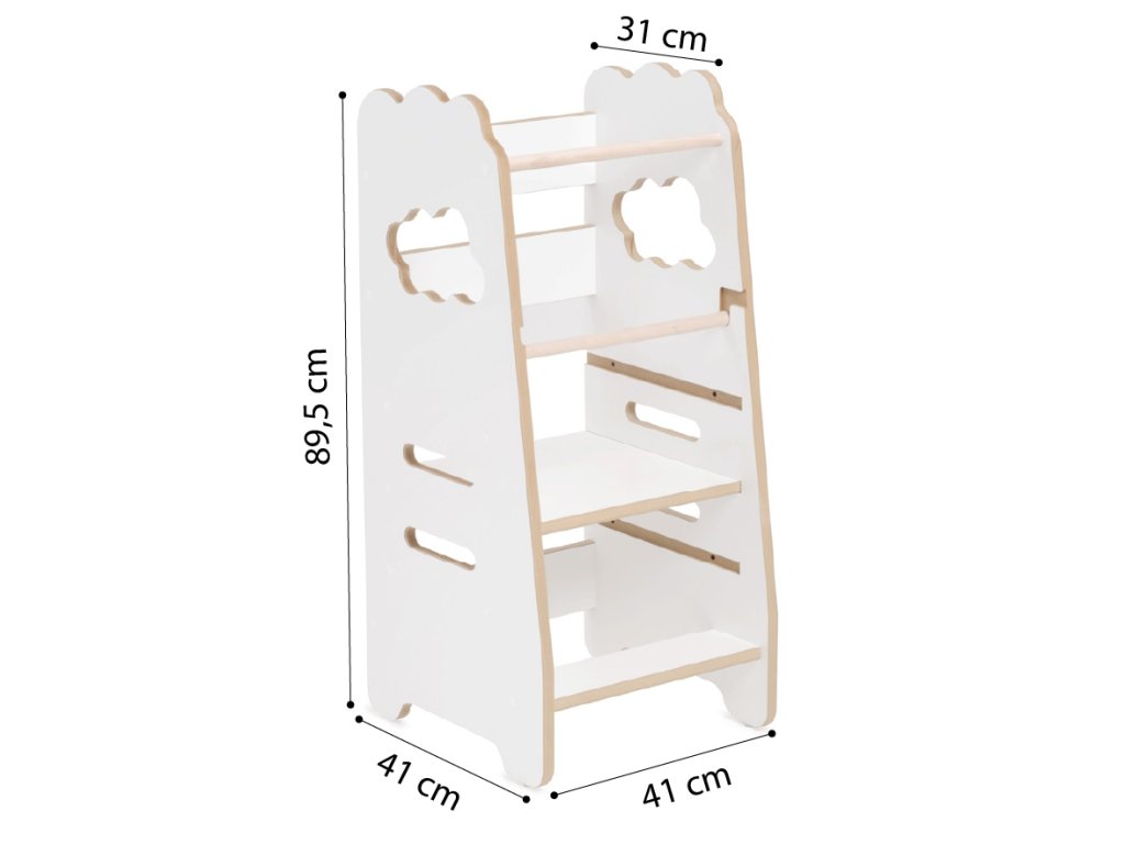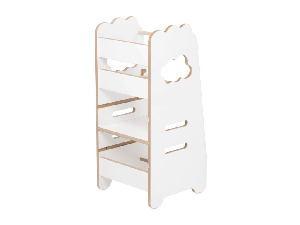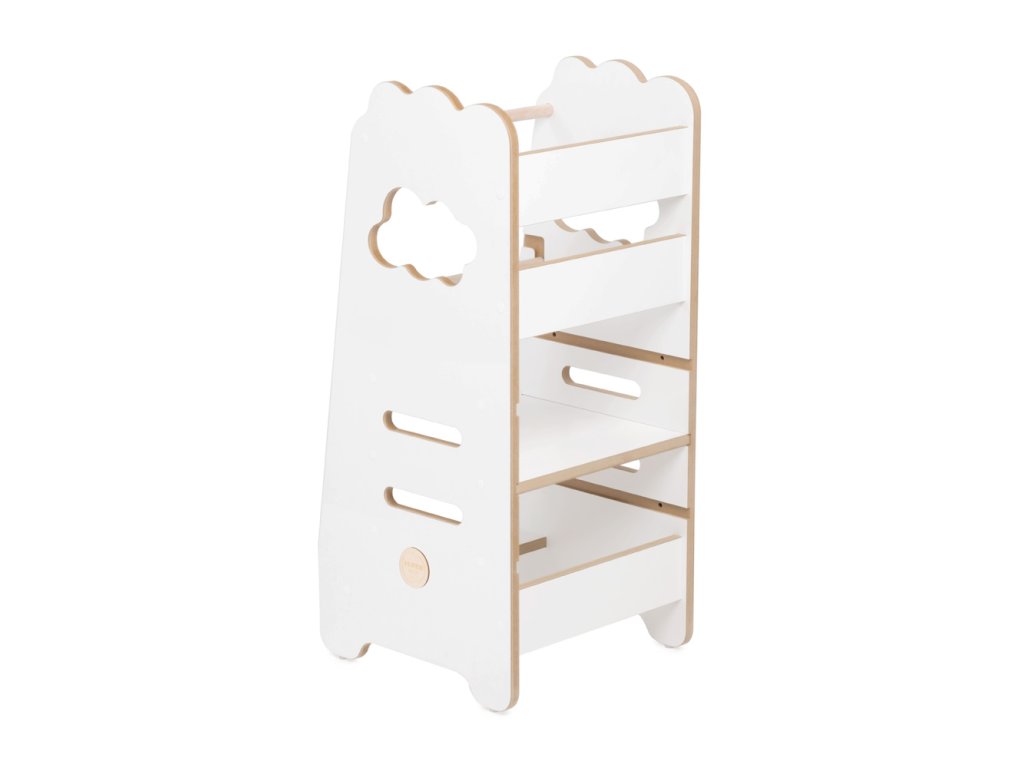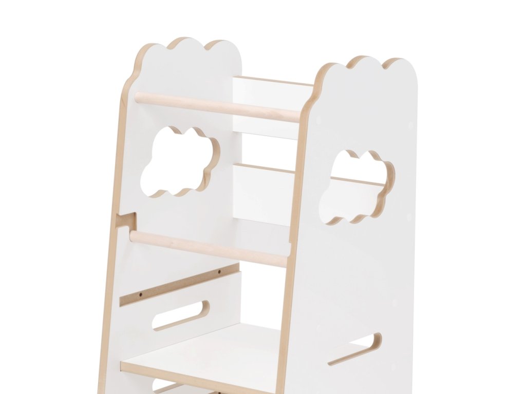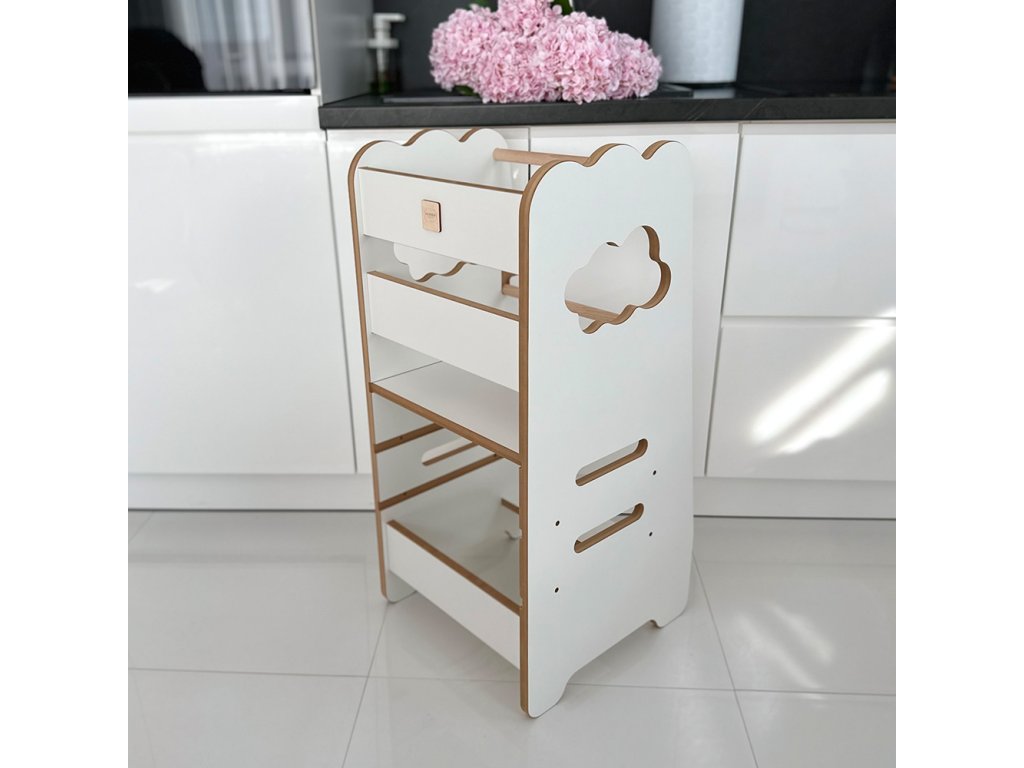 Drevená učiaca veža / Kuchynský pomocník 3 nastavenia výšky, biela, s motívom obláčika