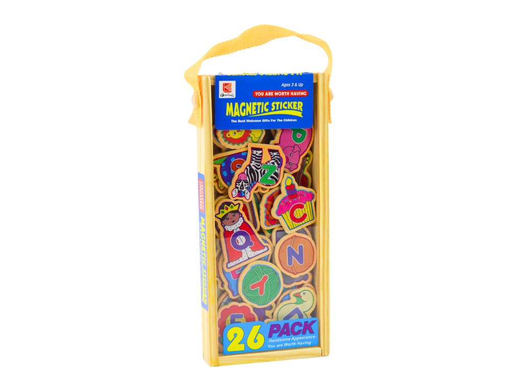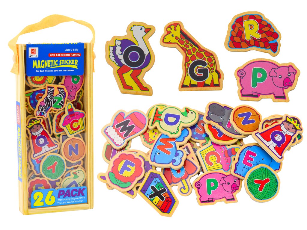 Súprava drevených magnetiek je perfektná vzdelávacia hračka pre deti. Obsahuje 26 farebných magnetov , z ktorých každý predstavuje iný predmet alebo zviera spolu s písmenkom, na ktoré začína jeho názov (v angličtine). Magnetky sú vyrobené z kvalitného dreva, čo zaručuje ich bezpečnosť a odolnosť pri každodennej hre.