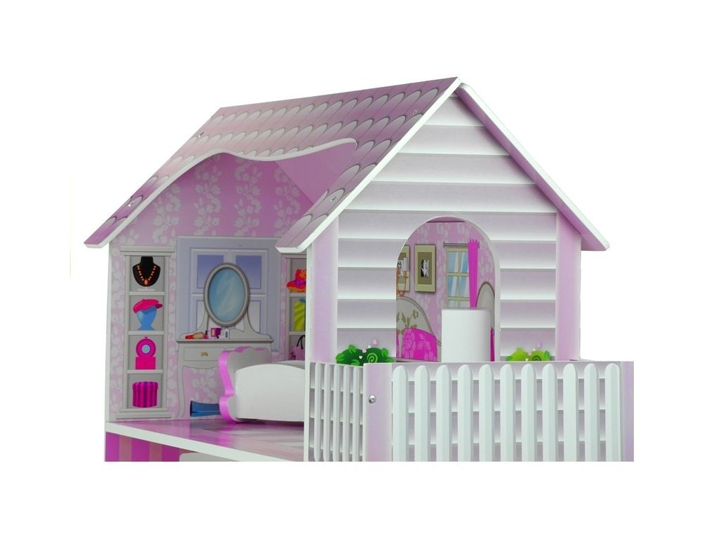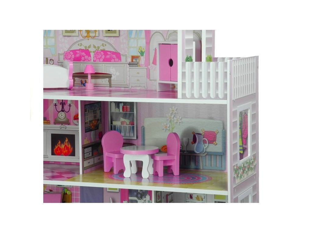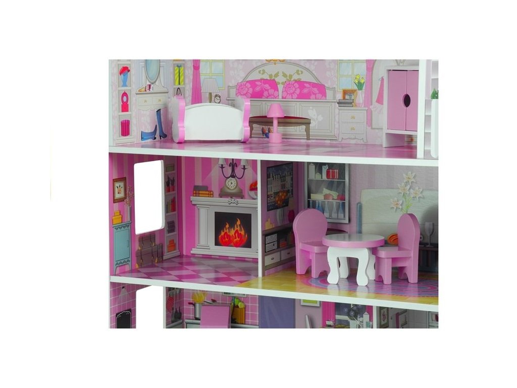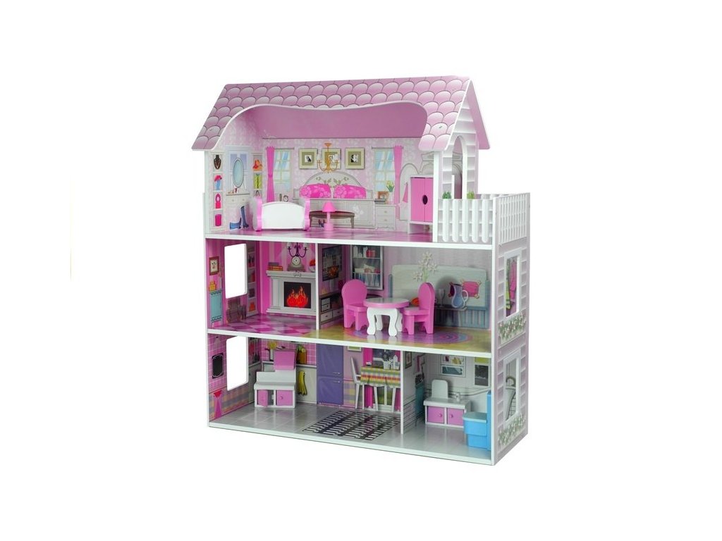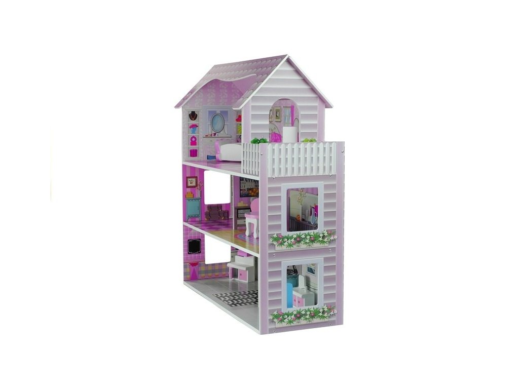 Predstavujeme Vám trojposchodový drevený domček pre bábiky. Dievčatká môžu pre svoje bábiky vytvárať vlastné imaginárny svet a rozvíjať tak svoju predstavivosť. Dom má 5 krásnych izieb s balkónom a kúpeľňou. Možnosti usporiadanie nábytku rozvíja predstavivosť a farby zdôrazní príjemnú rodinnú atmosféru. Hračka je určená od 3 rokov.