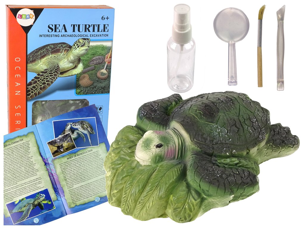 V sade nájdete všetky nástroje, ktoré malý archeológ potrebuje: realistickú skamenelinu korytnačky, fľašu na vodu, štetec na jemný peľ, lupu a kopacie náčinie. Táto komplexná sada je ideálnou voľbou pre milovníkov podmorského života a archeológie. Hračka je jednoduchá na skladovanie a prenášanie.