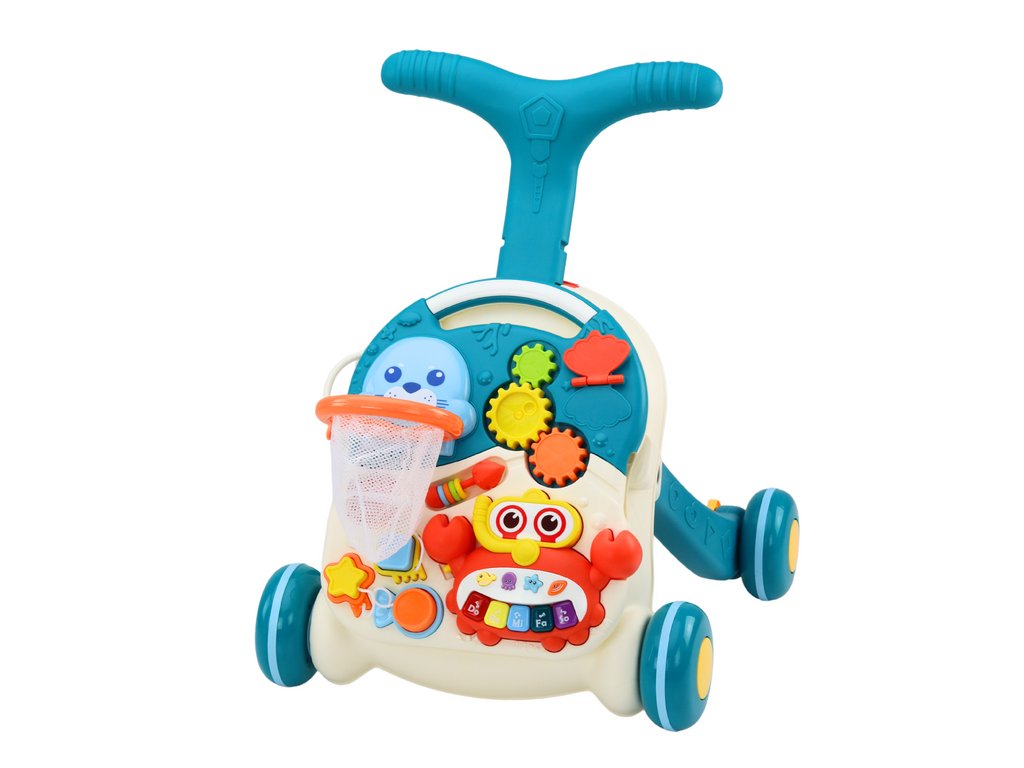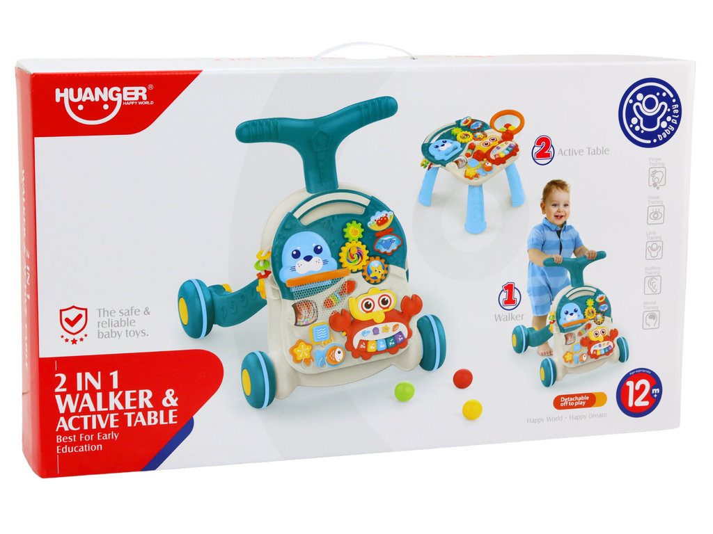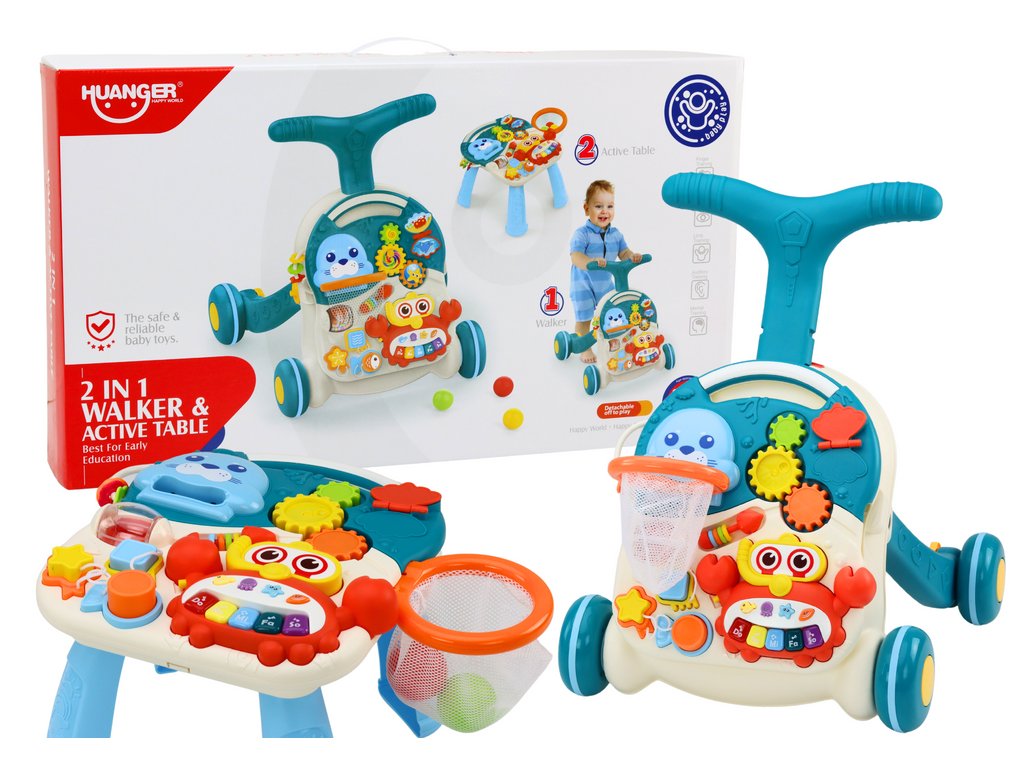 Hračka 2v1 "Vzdelávací stolík a chodítko" ponúka komplexnú zábavu a vzdelanie, podporuje rozvoj dieťaťa v mnohých smeroch, od kognitívnych a motorických po hudobné a senzorické zručnosti.