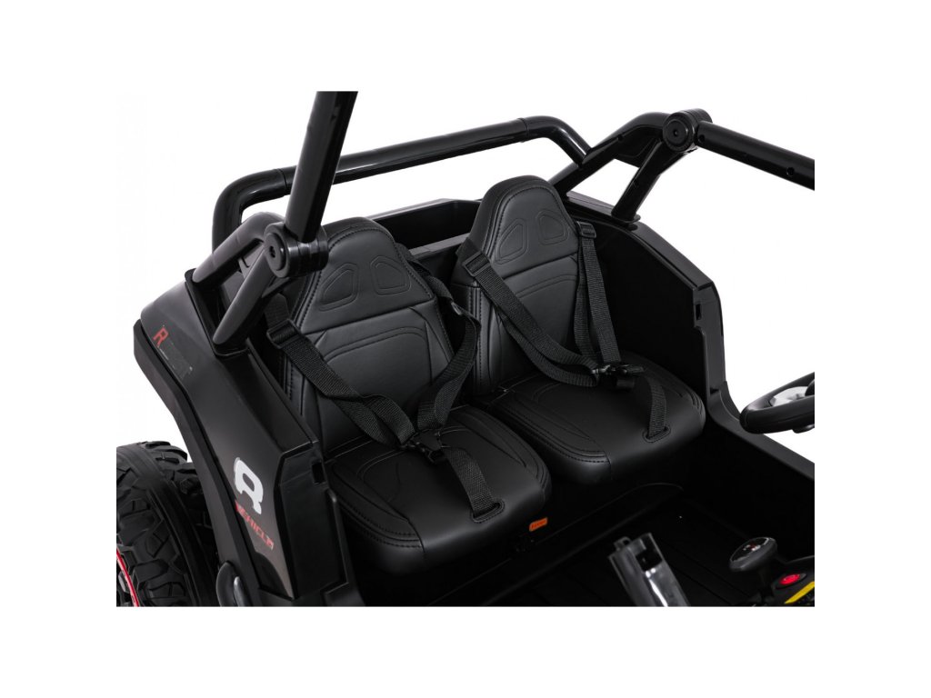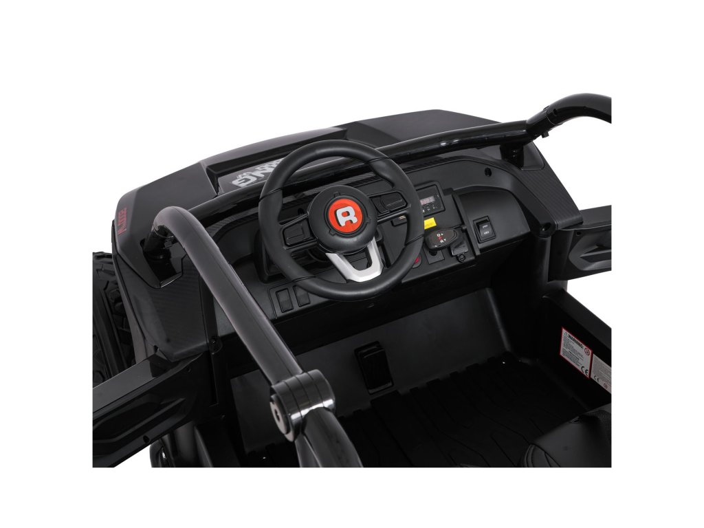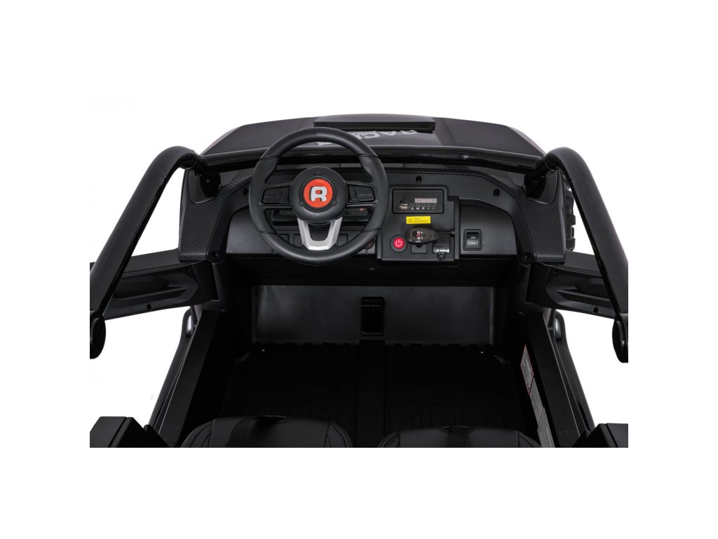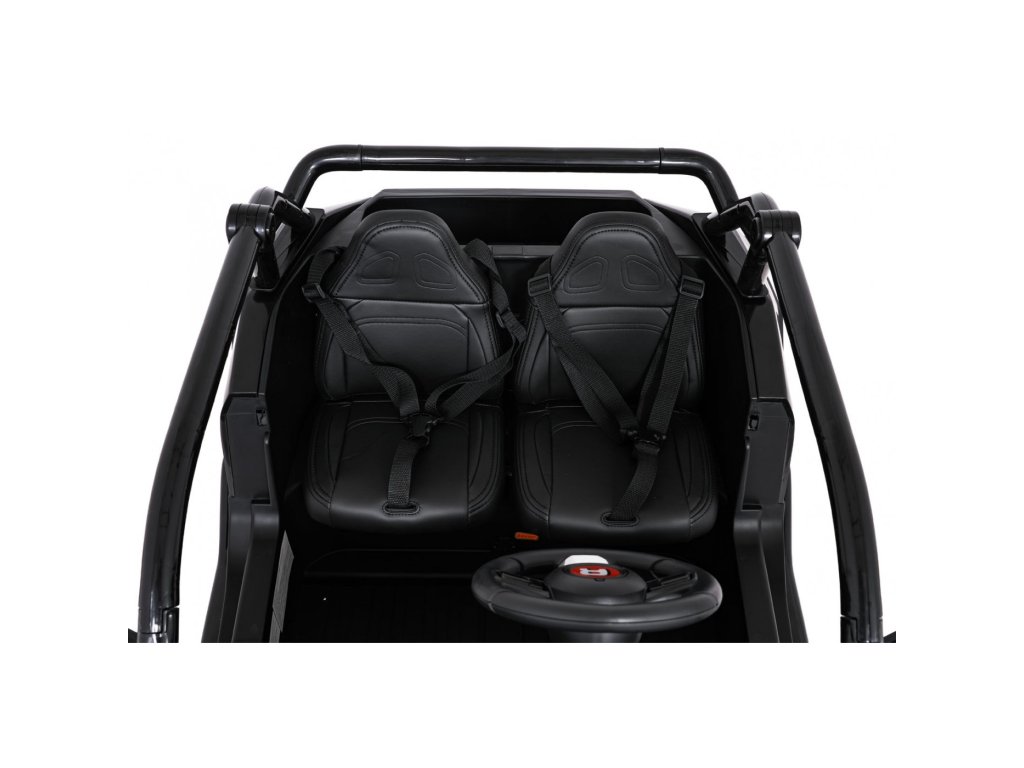 Dve samostatné sedačky potiahnuté ekokožou sú vybavené bezpečnostnými pásmi a umožňujú jazdu dvom deťom súčasne. Otvárateľné dvere s bezpečnostnou poistkou zaisťujú ľahké a bezpečné nastupovanie. LED svetlá vpredu aj vzadu , realistické zvuky motora a ďalšie audio efekty prinášajú autentický zážitok z jazdy. Multimediálny panel umožňuje pripojenie cez USB, AUX aj MP3, nechýba ani FM rádio a ovládacie tlačidlá na volante.