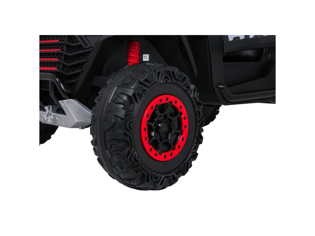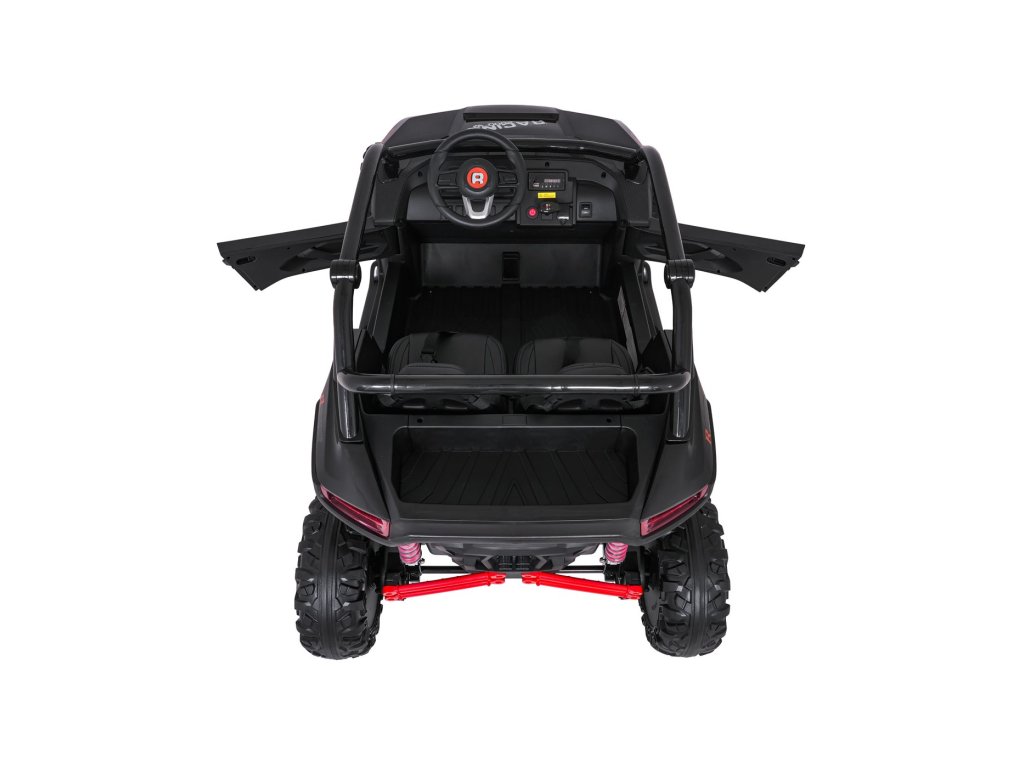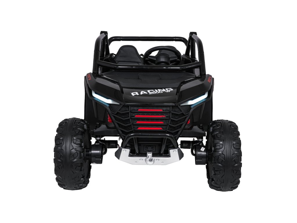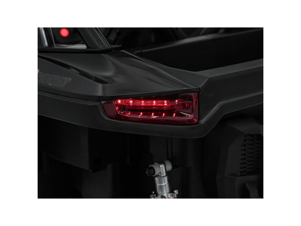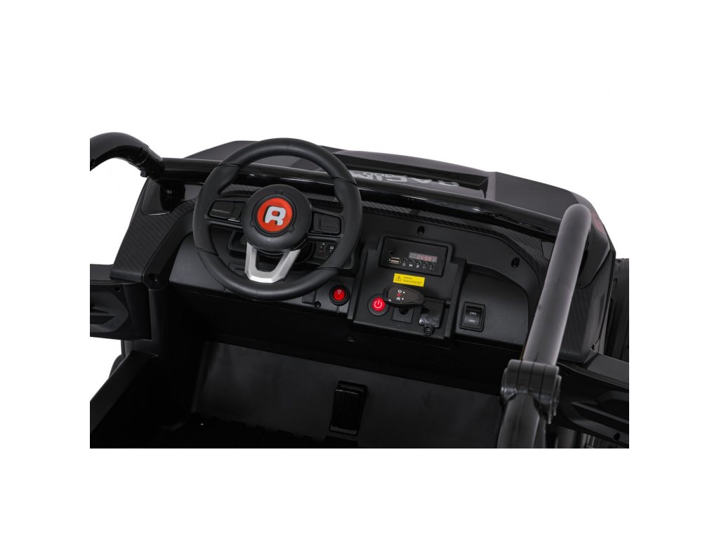 Dve samostatné sedačky potiahnuté ekokožou sú vybavené bezpečnostnými pásmi a umožňujú jazdu dvom deťom súčasne. Otvárateľné dvere s bezpečnostnou poistkou zaisťujú ľahké a bezpečné nastupovanie. LED svetlá vpredu aj vzadu , realistické zvuky motora a ďalšie audio efekty prinášajú autentický zážitok z jazdy. Multimediálny panel umožňuje pripojenie cez USB, AUX aj MP3, nechýba ani FM rádio a ovládacie tlačidlá na volante.