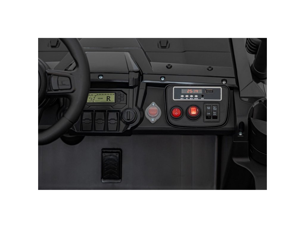 Autíčko môžete ovládať pomocou diaľkového ovládania , ktoré pracuje na frekvencii 2,4 GHz . Na diaľkovom ovládači sú tri rýchlosti a bezpečnostné tlačidlo STOP , ktoré po stlačení okamžite zastaví autíčko. Sedačka je pokrytá ekologickou kožou a nachádza sa na nej bezpečnostné pásy .