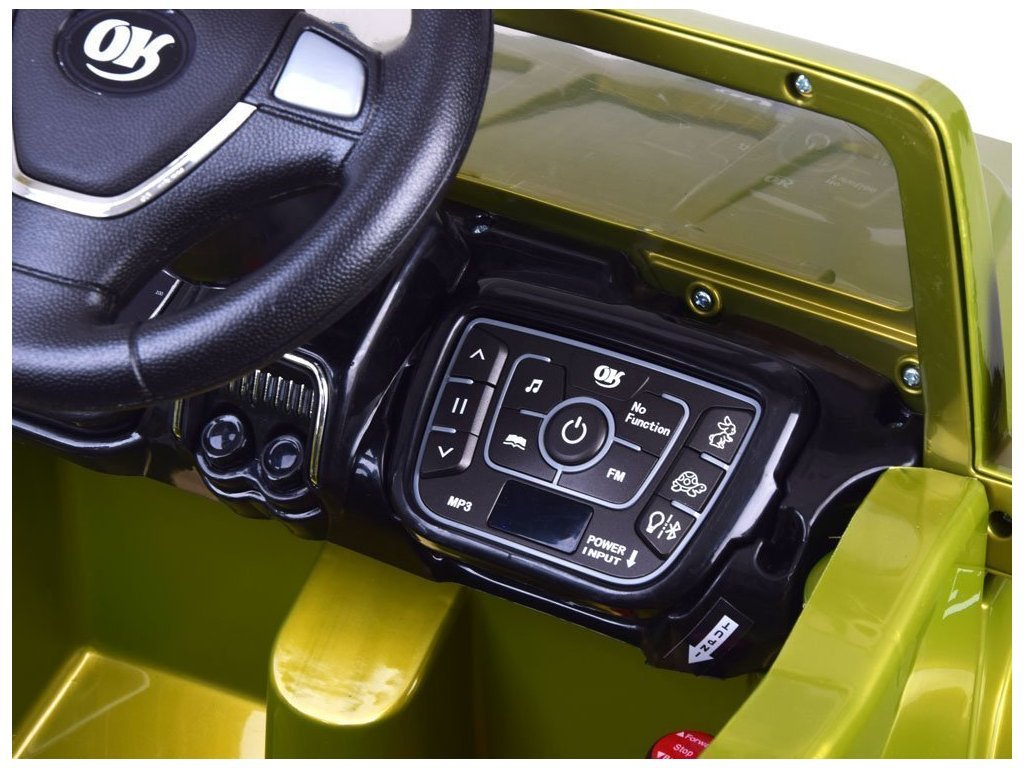 Vďaka 2 výkonným motorom a 3 rýchlostiam môže vozidlo ľahko zvládať nerovnosti, jazdu v záhrade. Auto s otváracími dverami zaistí pohodlné nastupovanie do autíčka. Vozidlo má možnosť nastaviť rýchlosť cez ovládač, ale tiež vo vozidle je spínač, ktorý mení rýchlosť pre rýchle alebo pomalé. Hudobný modul s naloženými veselými piesňami zaistí radostnú jazdu. Vďaka hudobnému panelu si vodič môže vybrať z možností počúvania hudby alebo vlastných skladieb z MP3.