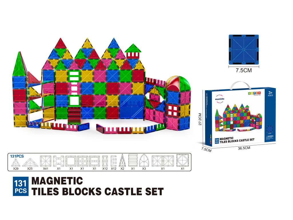 Stavebnica obsahuje 131 magnetických dielov v rôznych tvaroch a farbách, vďaka ktorým si deti môžu postaviť vlastný palác, mesto alebo fantazijné stavby. Všetky dieliky majú jednotnú veľkosť 7,5 cm, ľahko do seba zapadajú a držia pevne vďaka kvalitnému magnetizmu. Skvelá voľba pre domáce hranie aj skupinové aktivity.