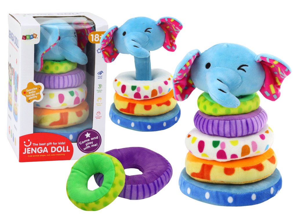 Na vrchole pyramídy sa nachádza roztomilý plyšový slon, ktorý dodáva prvku hravosti a priateľstva pre deti. Hračka je ideálna pre deti od 18 mesiacov veku, ktoré budú mať veľa zábavy pri skladaní krúžkov a maznaní sa s plyšovým slonom. Je to vynikajúci spôsob, ako rozvíjať kognitívne a senzorické zručnosti najmenších detí bezpečne a príjemne.