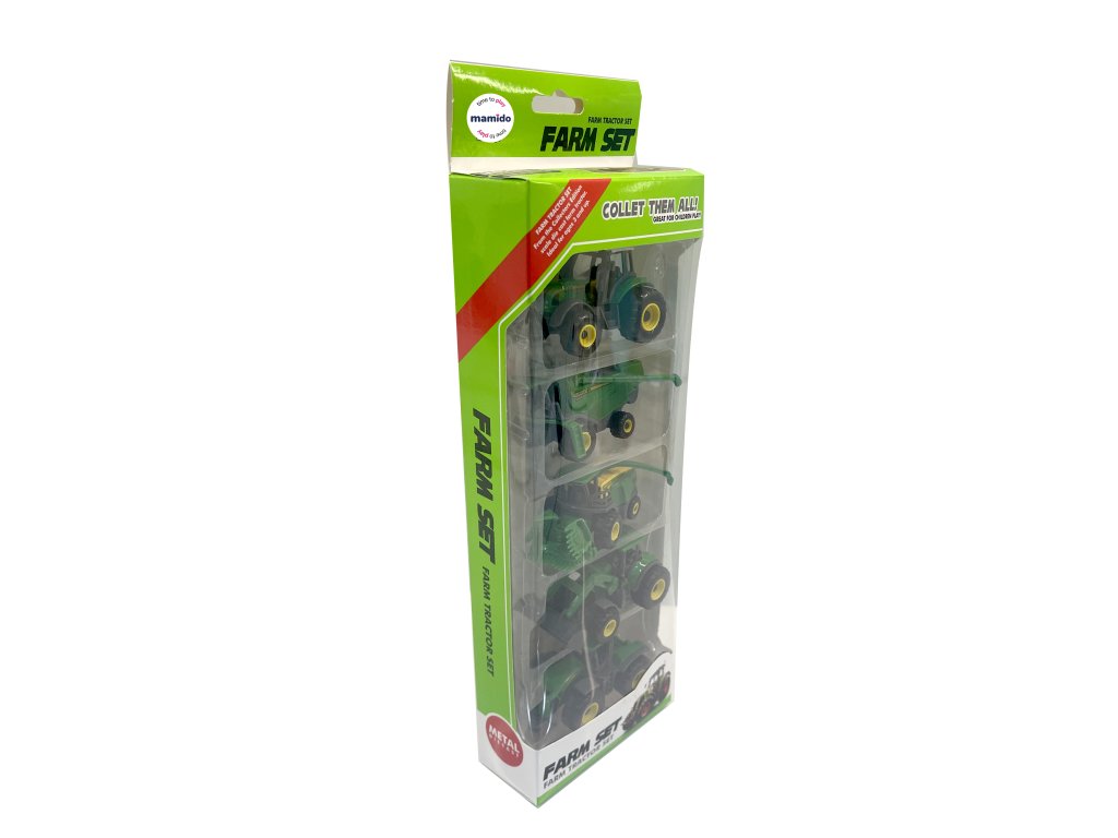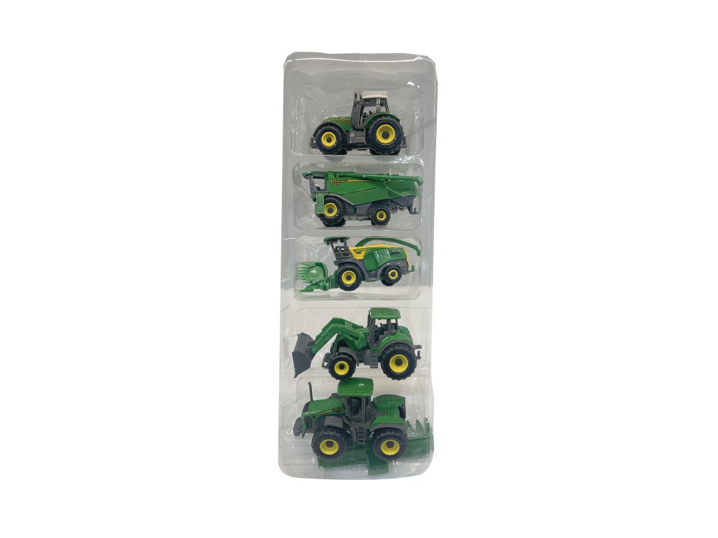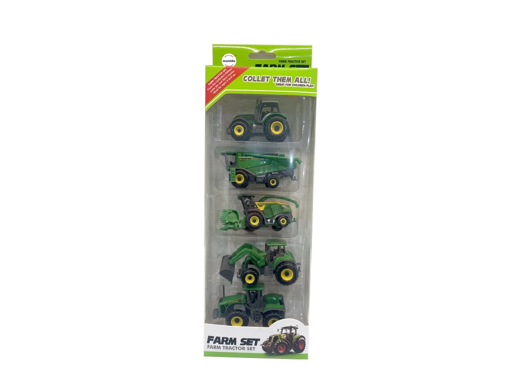 Detailne spracovaná súprava piatich kovových poľnohospodárskych strojov v mierke 1:64 poteší všetkých malých fanúšikov traktorov a práce na farme. Každé vozidlo je vybavené pohonom s posuvným mechanizmom, vďaka ktorému sa ľahko rozbehne po hladkom povrchu. Modely zahŕňajú rôzne typy farmárskych vozidiel – traktor, nakladač, sejačku, kombajn či ďalšiu pracovnú techniku.
