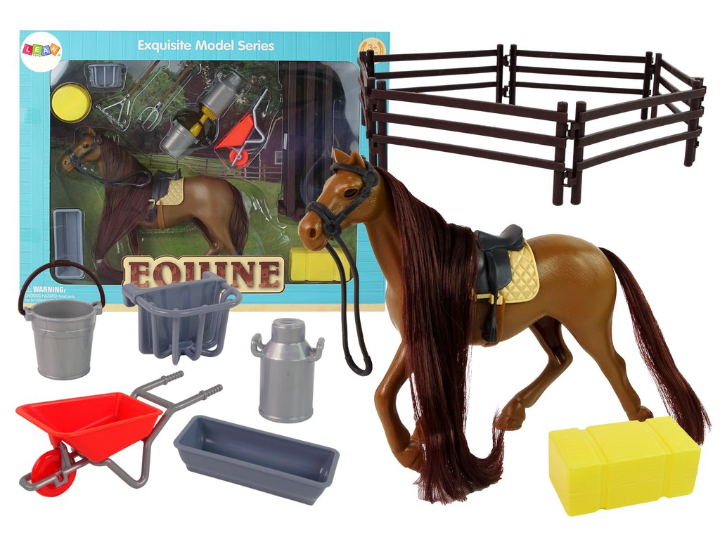 Sada sa skladá z figúrky koňa s dlhou hrivou, ktorá je ideálna na česanie a zapletanie. Okrem toho sada obsahuje doplnky nevyhnutné pre každodenný život a udržiavanie poriadku v stajni, ako je traktory a hrable. To však nie je všetko, musíte sa postarať o to, aby mal kôň čo jesť a piť, na to budete potrebovať napájačky a seno. Miesto, kde budú mať kone svoj výbeh, označíte špeciálnym plotom.