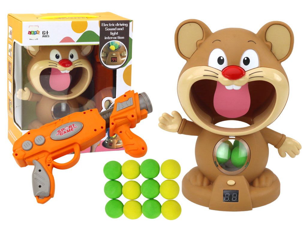 Hrací set je veľmi jednoduchý na použitie. Stačí nabiť pištoľ mäkkými guličkami a potom zamieriť na hlavu škrečka. Keď trafíte jazyk škrečka, hra vydá zvuk potvrdzujúci zásah a na malom LCD displeji uvidíte svoje skóre zobrazené vo forme bodov. V sete tiež nájdete pištoľ a špeciálne mäkké guličky, ktoré Vám umožnia dlhé hodiny zábavy.