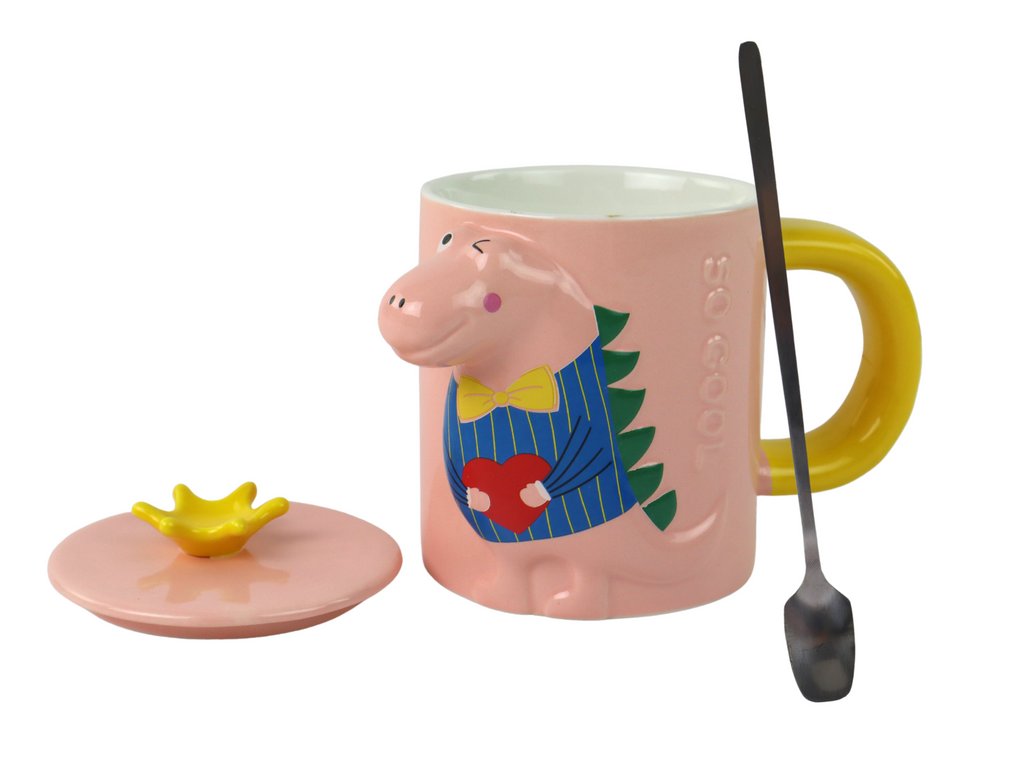 Hrnček s neobvyklým trojrozmerným motívom dinosaura , ktorý je vyrazený na povrchu. Dinosaurus je oblečený v rôznych farbách, čo pridáva zábavný a estetický prvok.