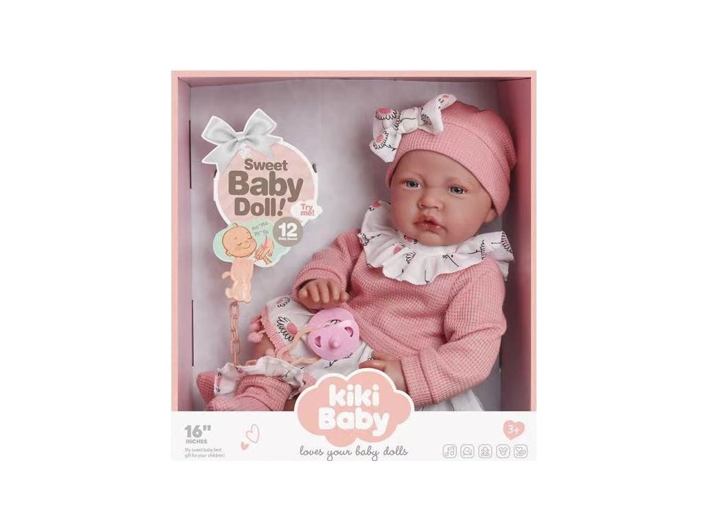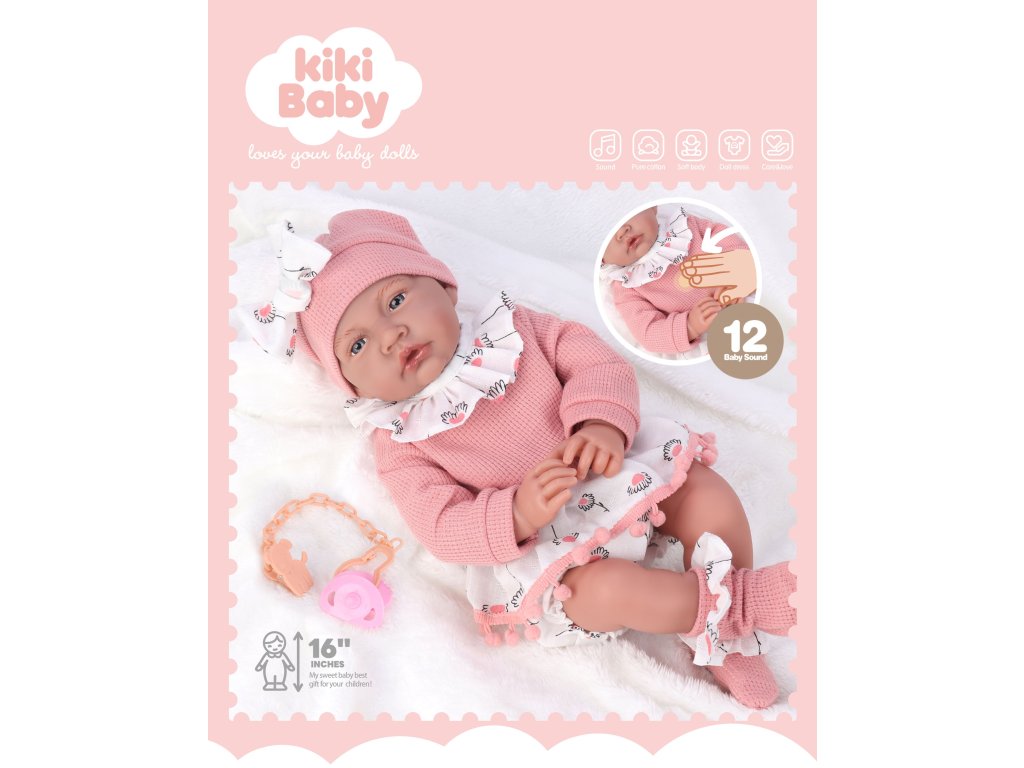 Interaktívna bábika Kiki Baby je perfektnou voľbou pre všetkých malých opatrovateľov, ktorí chcú napodobňovať svet dospelých a zažiť radosť zo starostlivosti o bábätko. S výškou 40 cm (16 palcov) je bábika dostatočne veľká, aby pôsobila realisticky, a jej jemný ružový obleček s volánikmi, čiapočkou a ponožkami dodáva hračke roztomilý a prívetivý vzhľad.