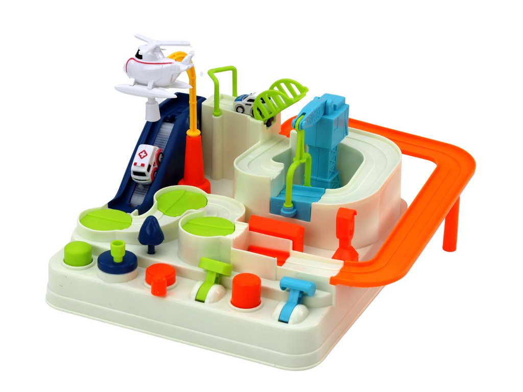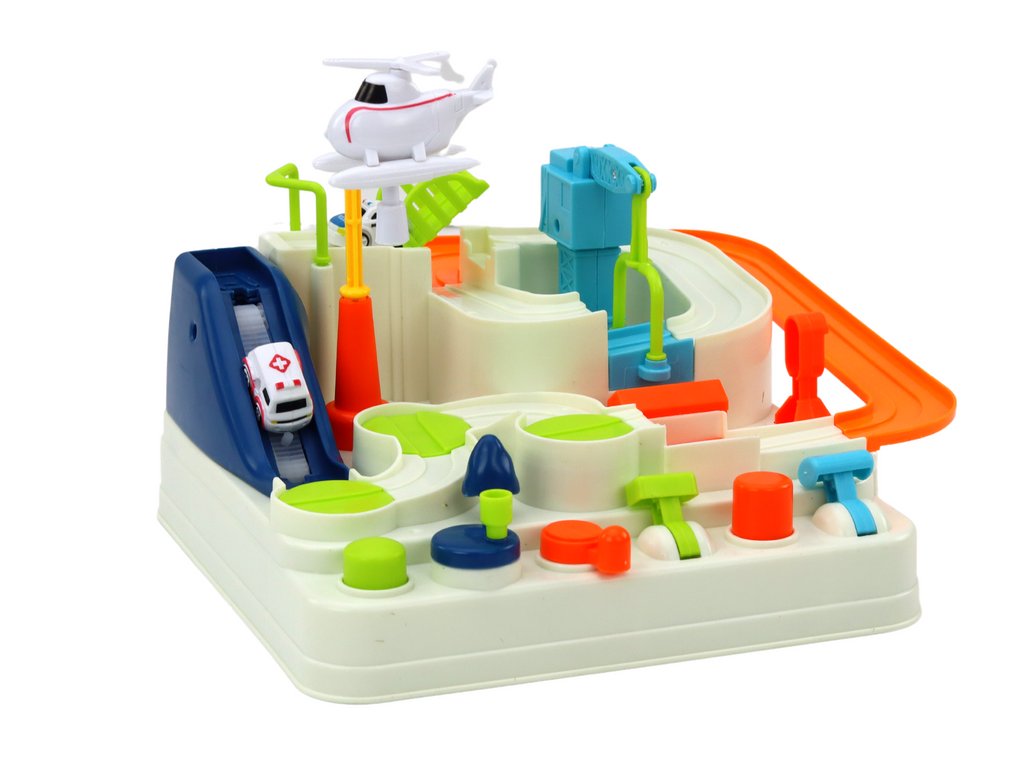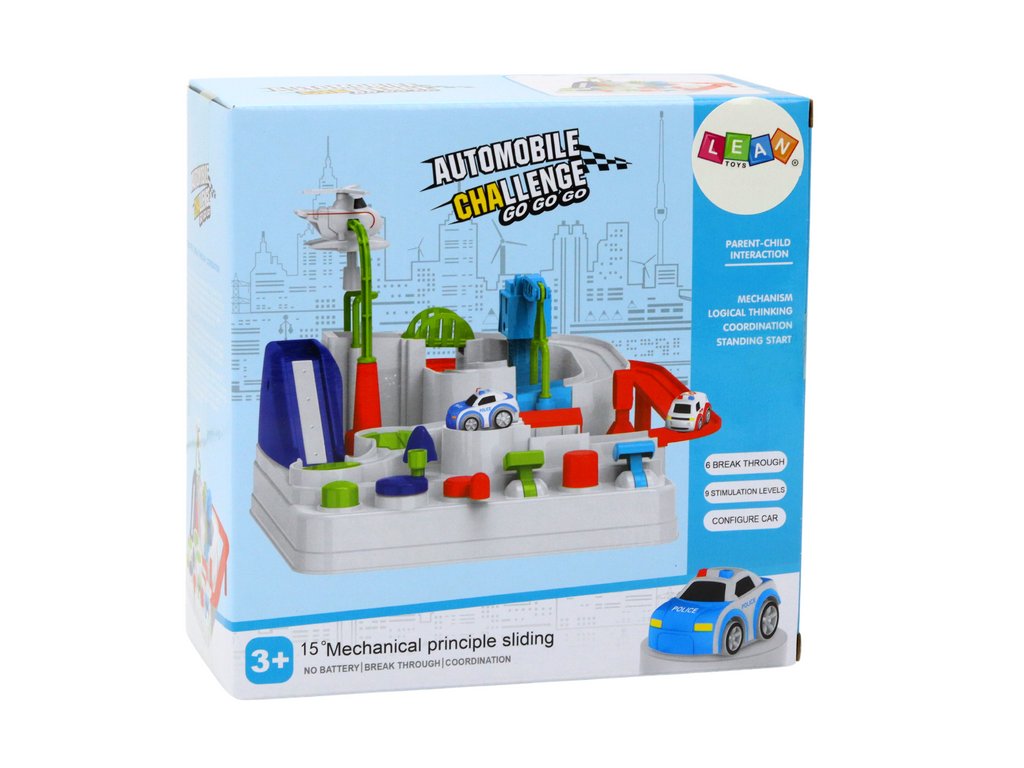 Súprava sa skladá z viacúrovňovej, farebnej prekážkovej dráhy, ktorá bola starostlivo navrhnutá tak, aby poskytla dieťaťu maximálnu zábavu a stimulovala jeho predstavivosť. Spolu s dvoma autíčkami môže dieťa prekonávať rôzne prekážky, ako sú šmykľavky alebo padacie mosty, pomocou špeciálnych tlačidiel a pák umiestnených na spodnej strane hernej dosky.