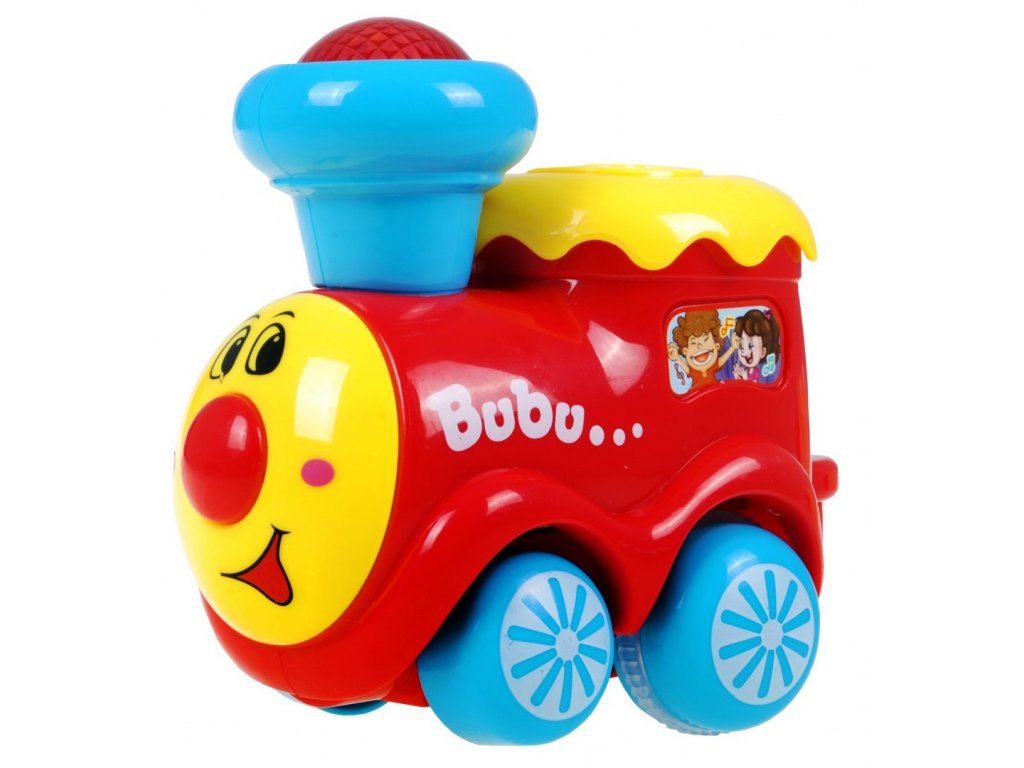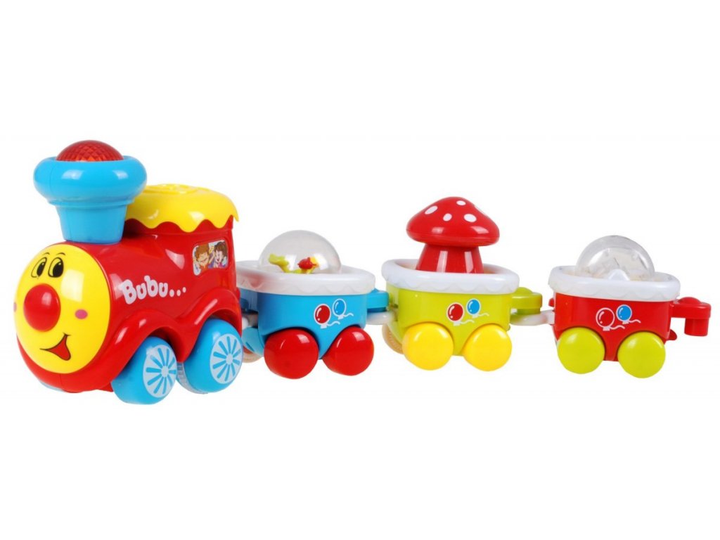 Interaktívne vláčik so zvukmi urobí radosť každému dieťaťu milujúcemu vlaky. Veselý vláčik v pohybe vás príjemne prekvapí. Vydáte sa na farebnú cestu za doprovodu príjemných melódií. Každý z troch vagóne má inú funkciu, nájdeme tu rotujúce muchotrávku, pohybujúce sa farebné kvety a hrkálka s farebnými guličkami. Okrem toho zábavu spestria farebne blikajúce komín, melódie a zvuk pracujúci lokomotívy. Lokomotívu s vagóny možno ľahko spojiť.
